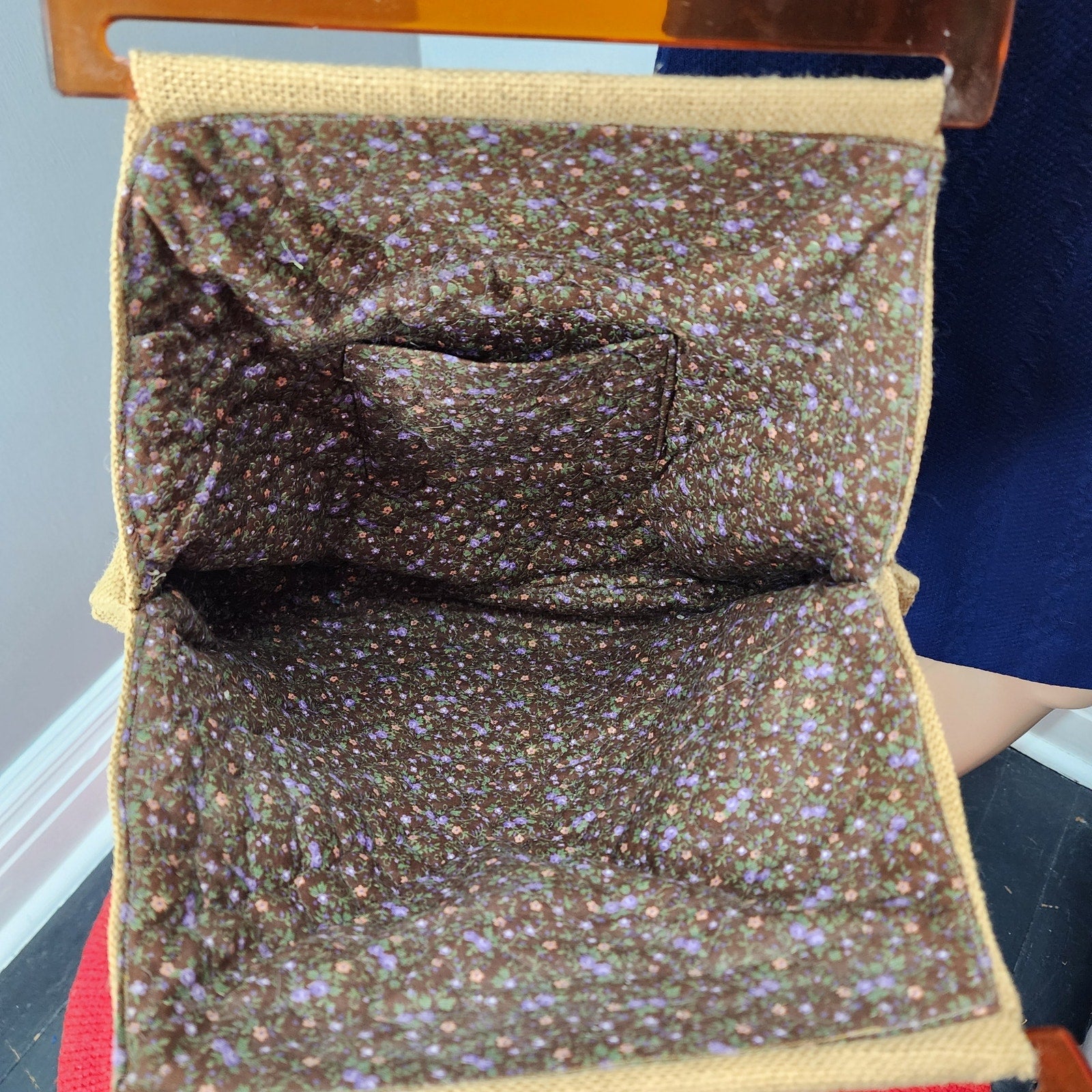 How cute is this handmade sac purse with huge plastic handles, embroidered burlap exterior and quilted ditzy printed fabric interior.