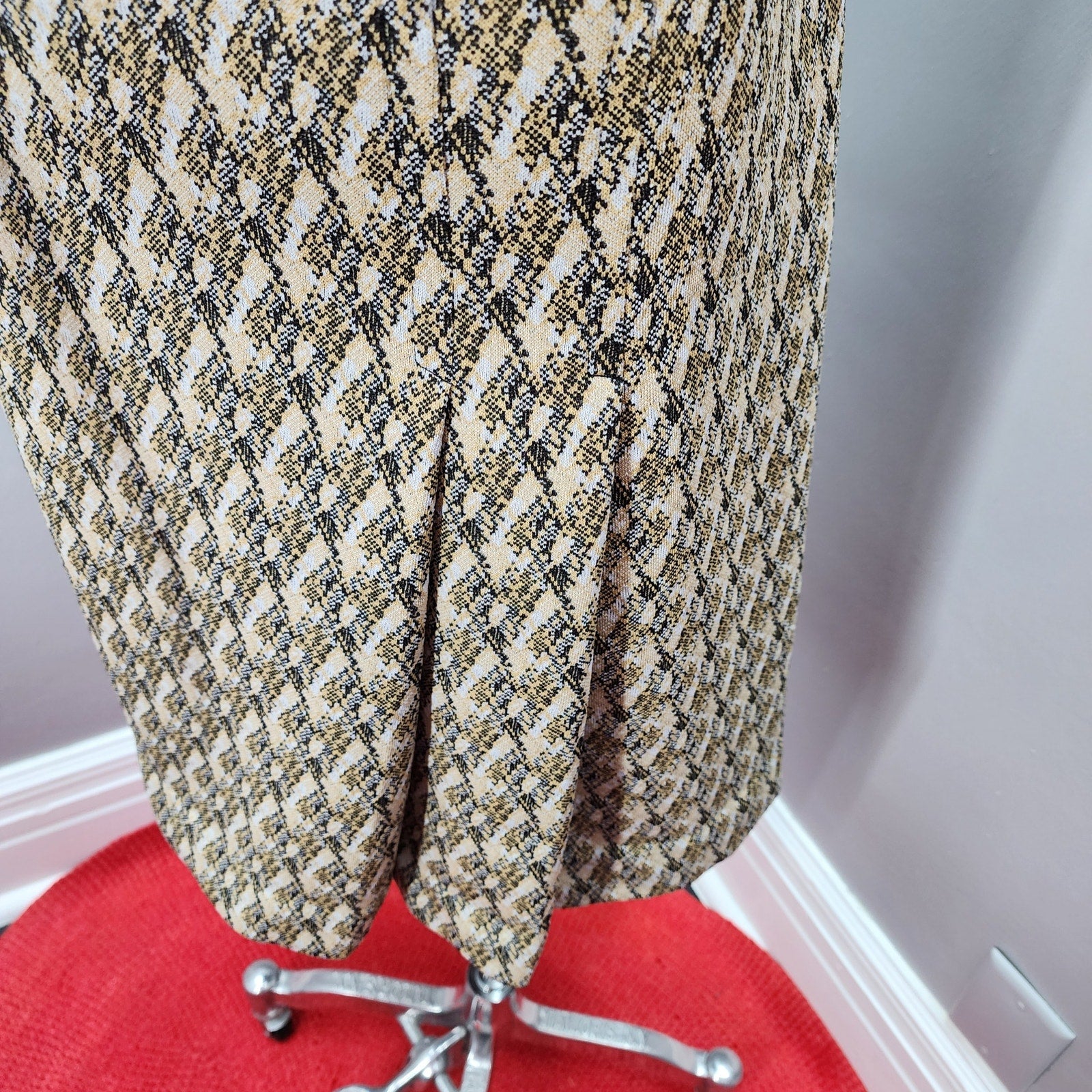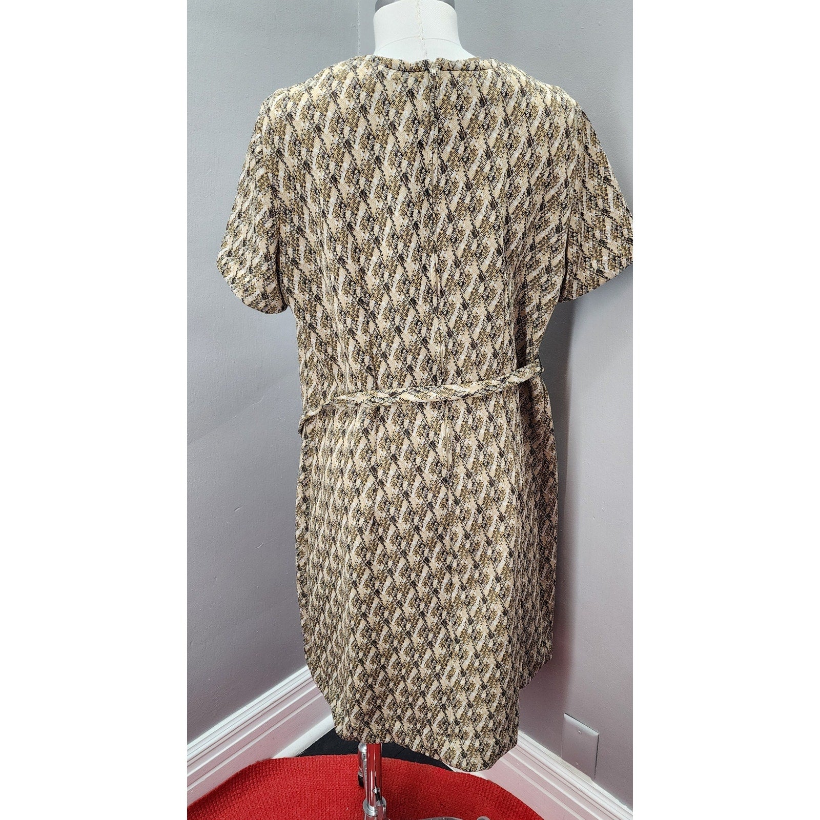 Cute and easy wearing Korell shift dress with original belt, abstract design in black, yellow and white, with a Zipper back closure.