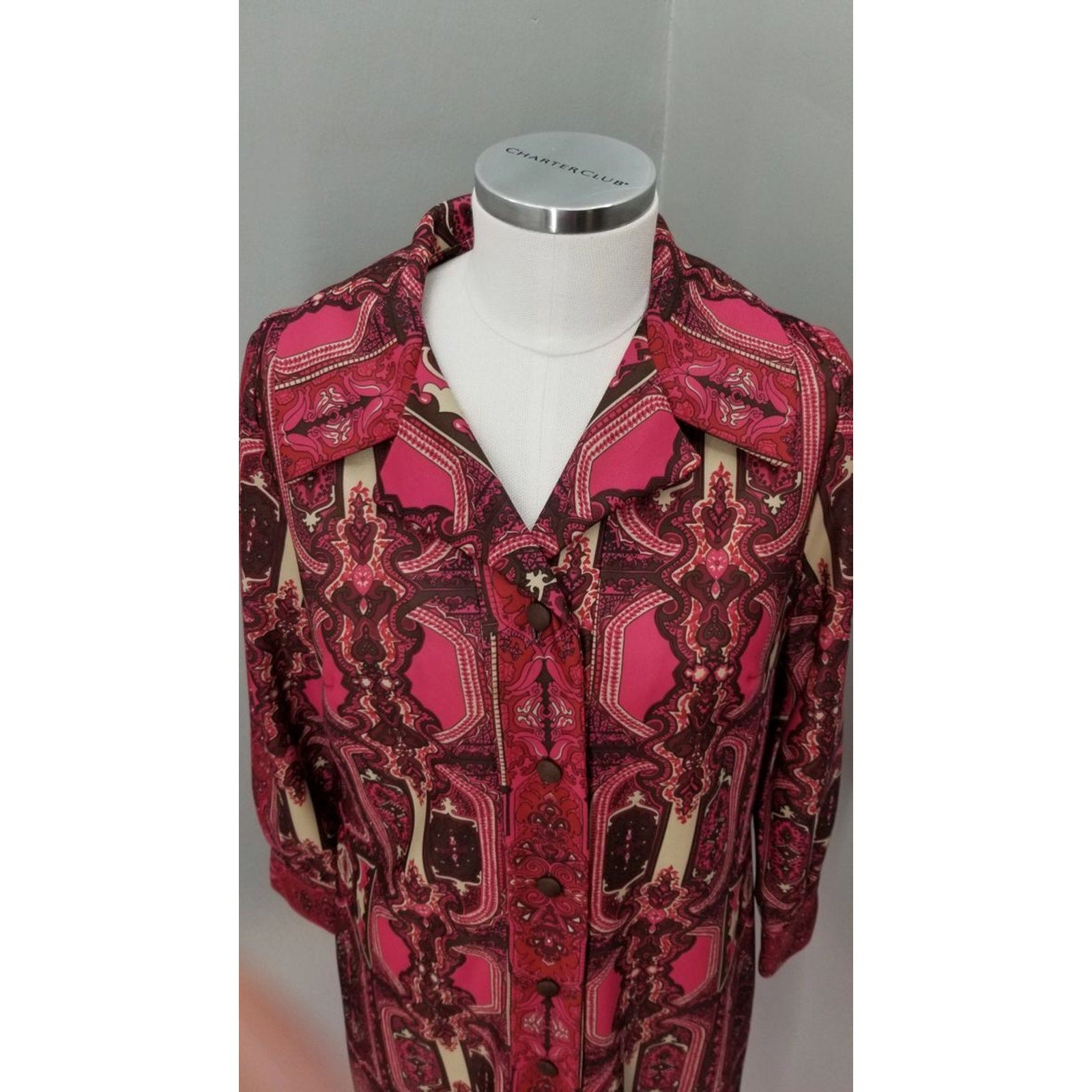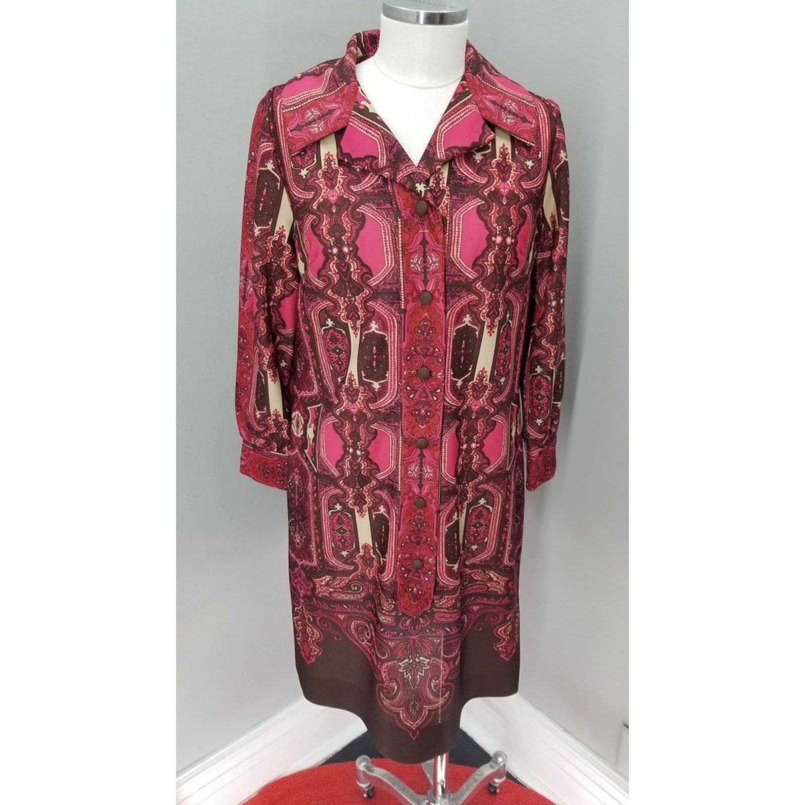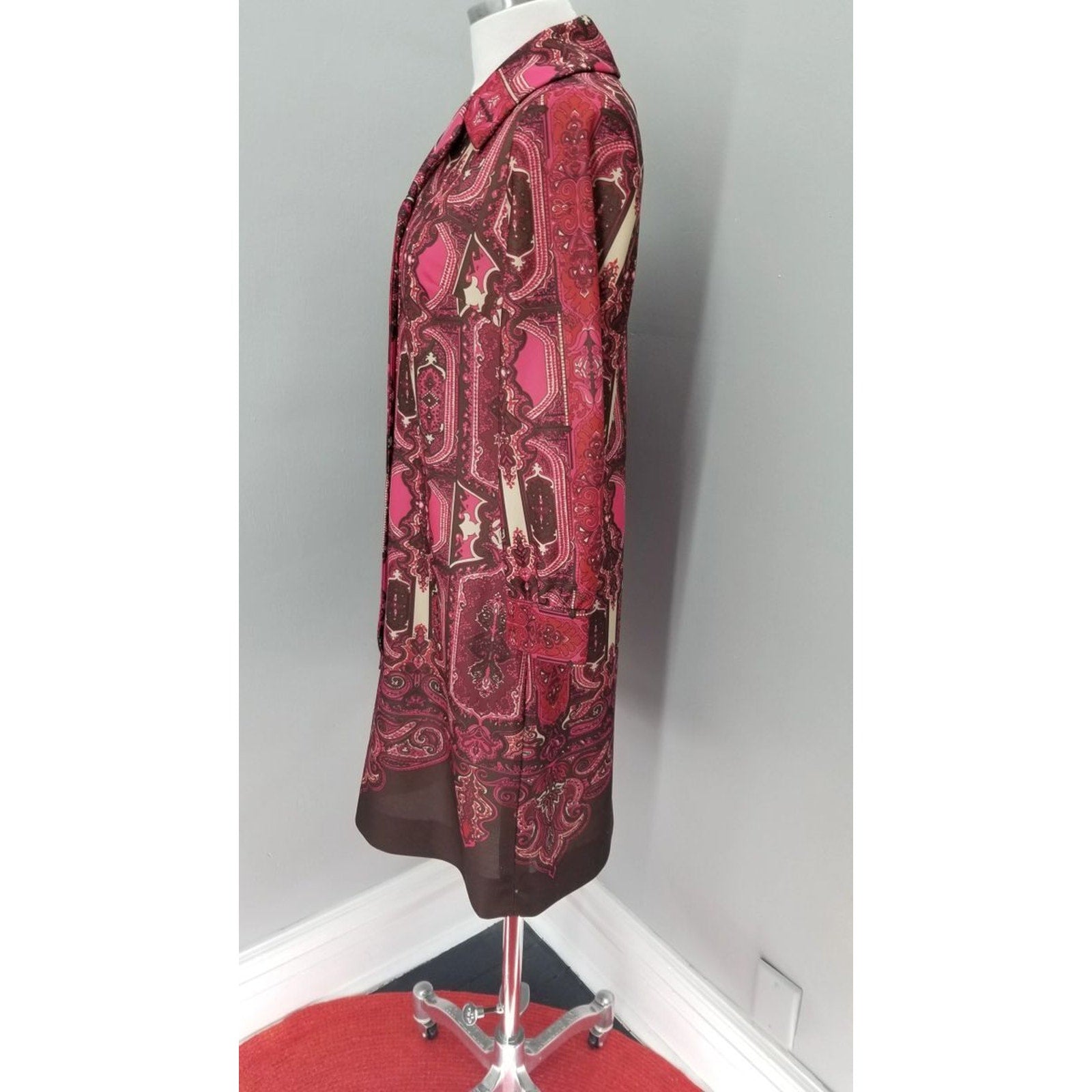 Heavy polyester knit shift style, with covered button front closure, darted bustline. Belt missing.