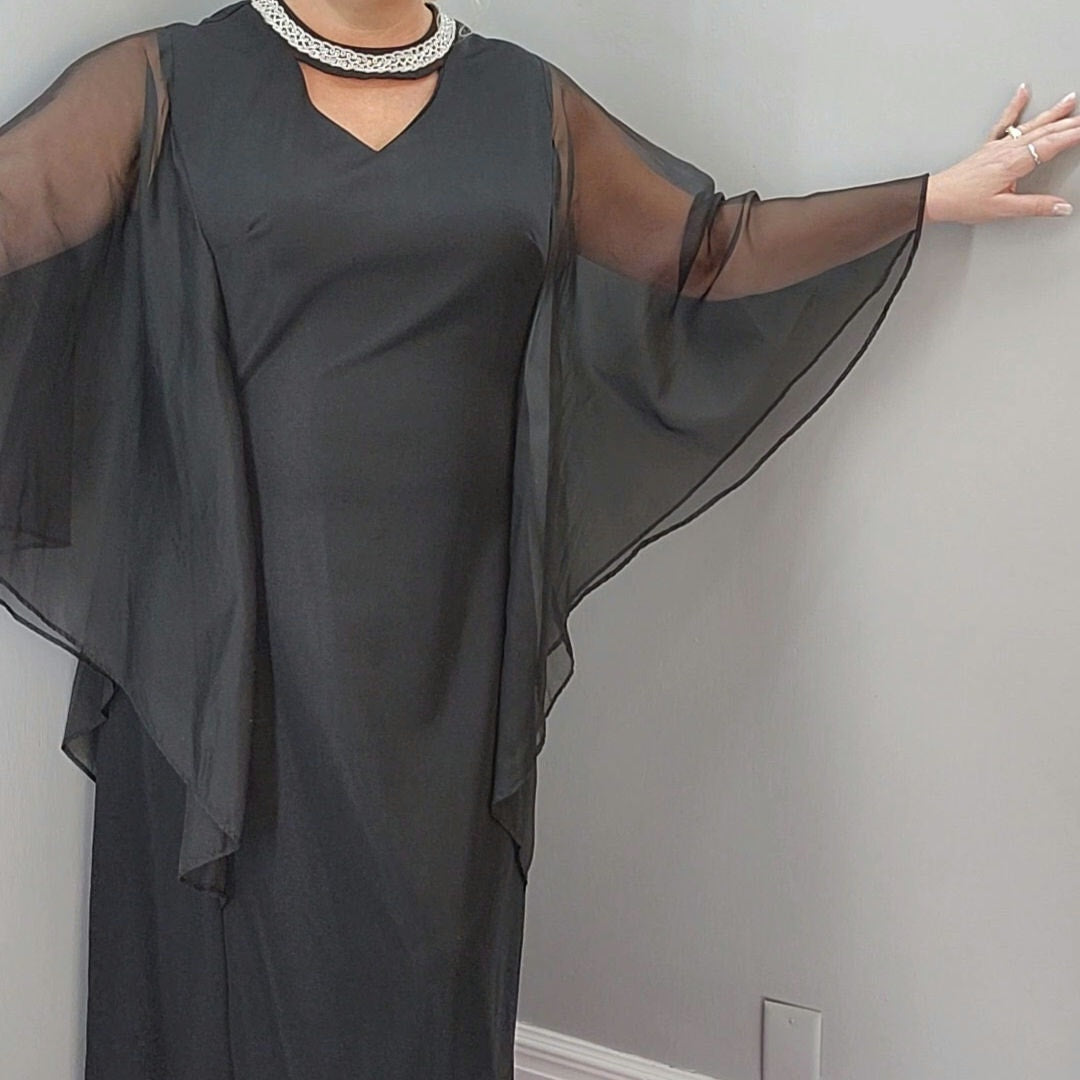 70s Vintage Lane Bryant Black Angel Wing Maxi Evening Gown - 24 1/2, 1X/2X