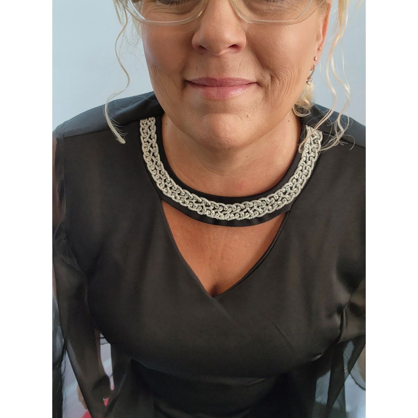 Huge sheer angel wing sleeves, silver applique choker collar with Peek-a-Boo neckline. Zipper back closure. Nice and long for the Tall Girls~