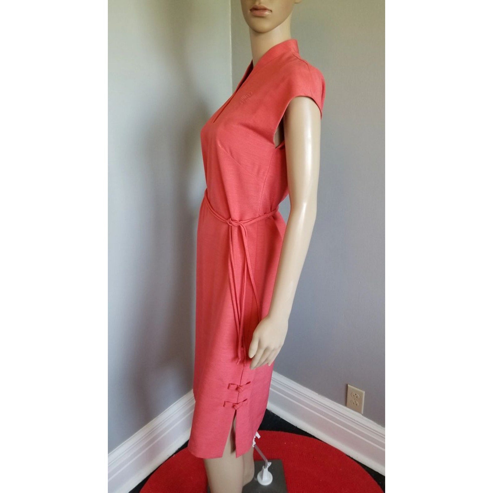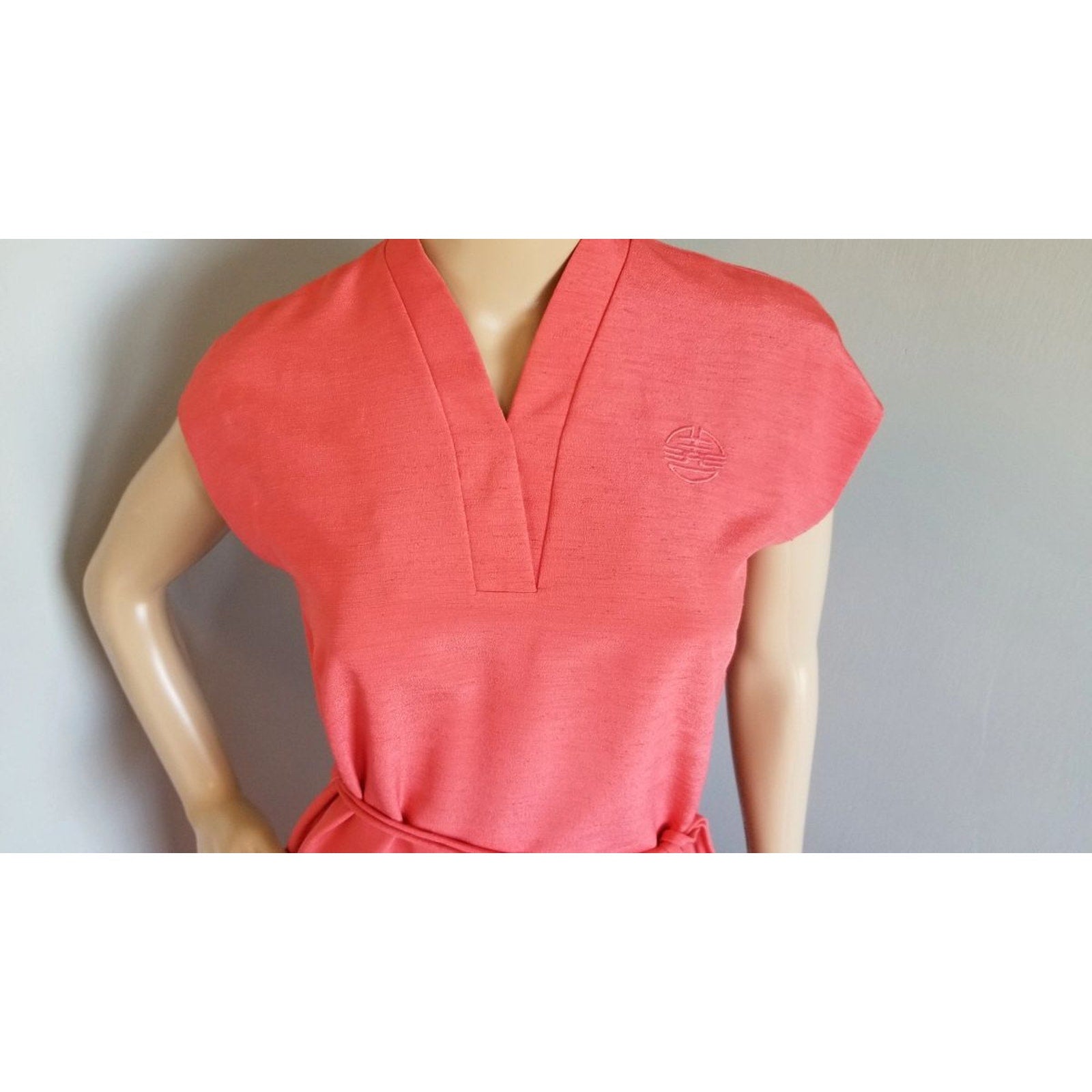 Without a material content label, the fabric appears to be a lightweight slub polyester, providing both comfort and a graceful drape. Its simplicity is accentuated by a matching belt that cinches at the waist, offering versatility and a flattering silhouette.
