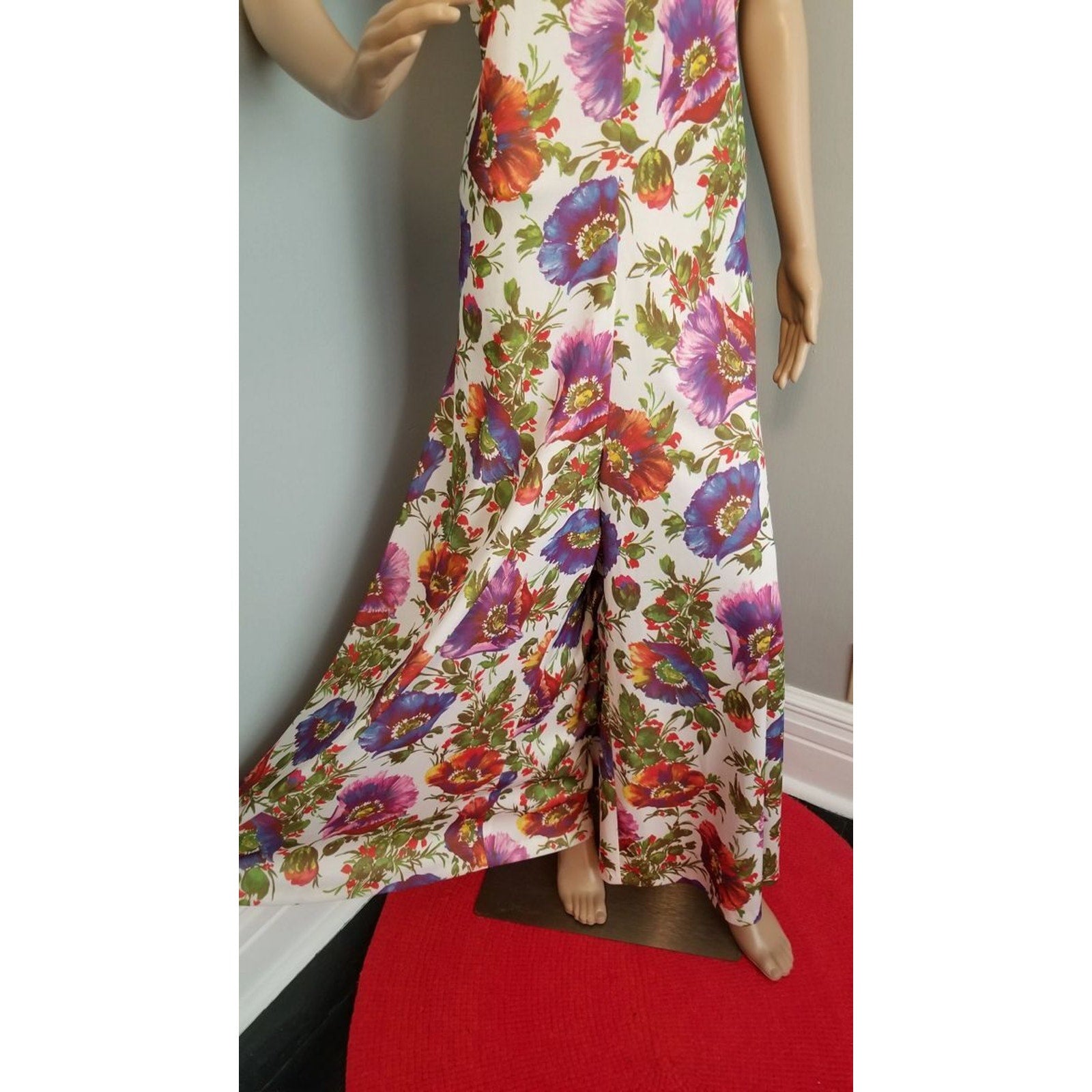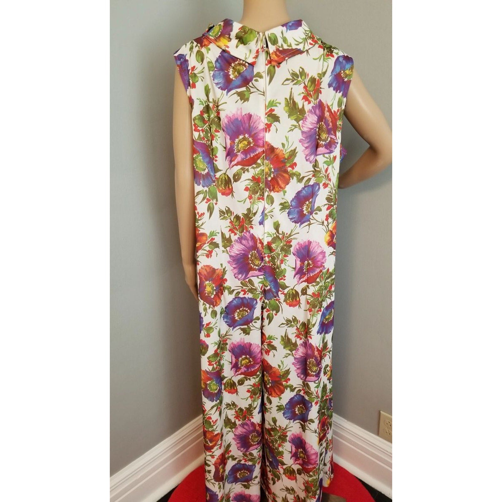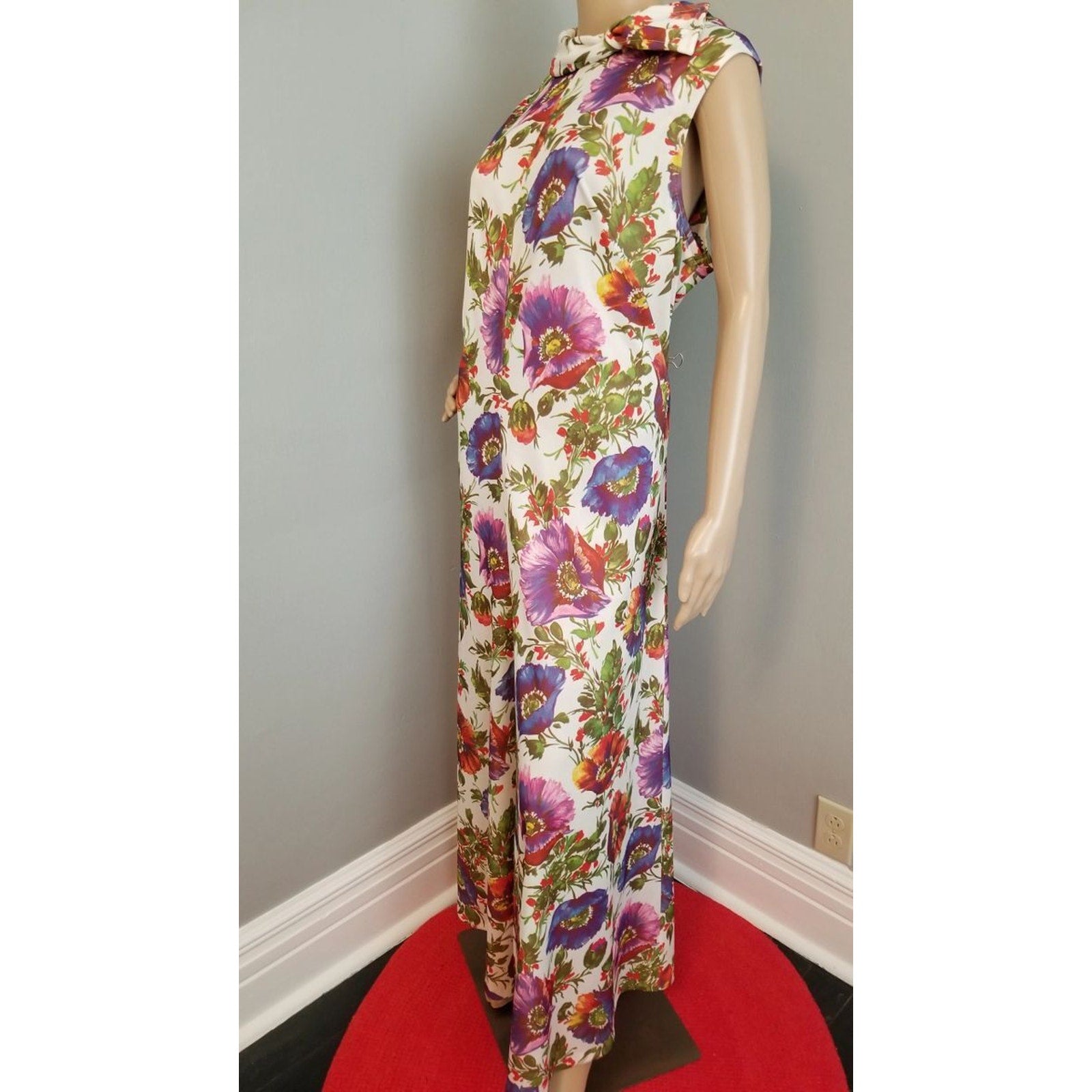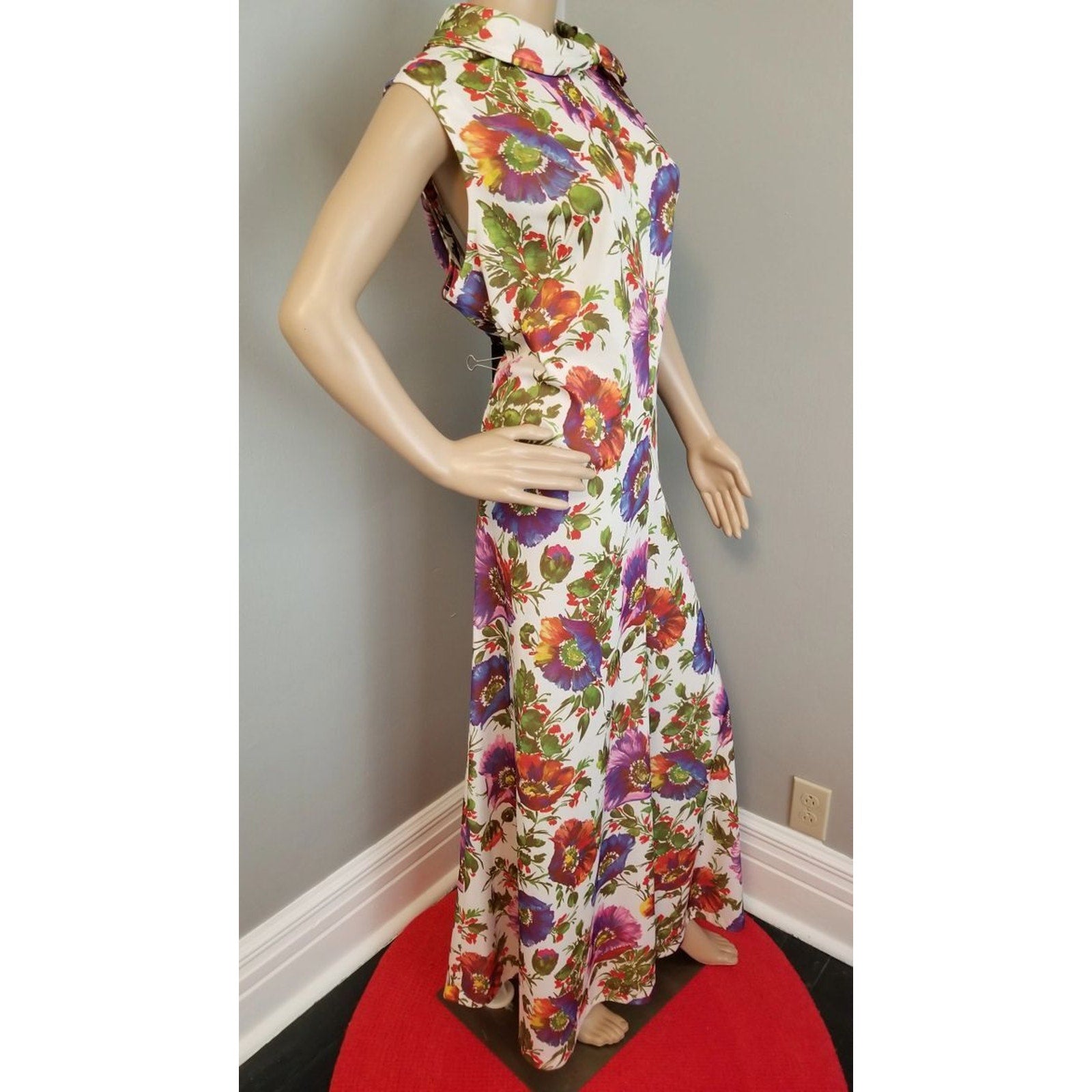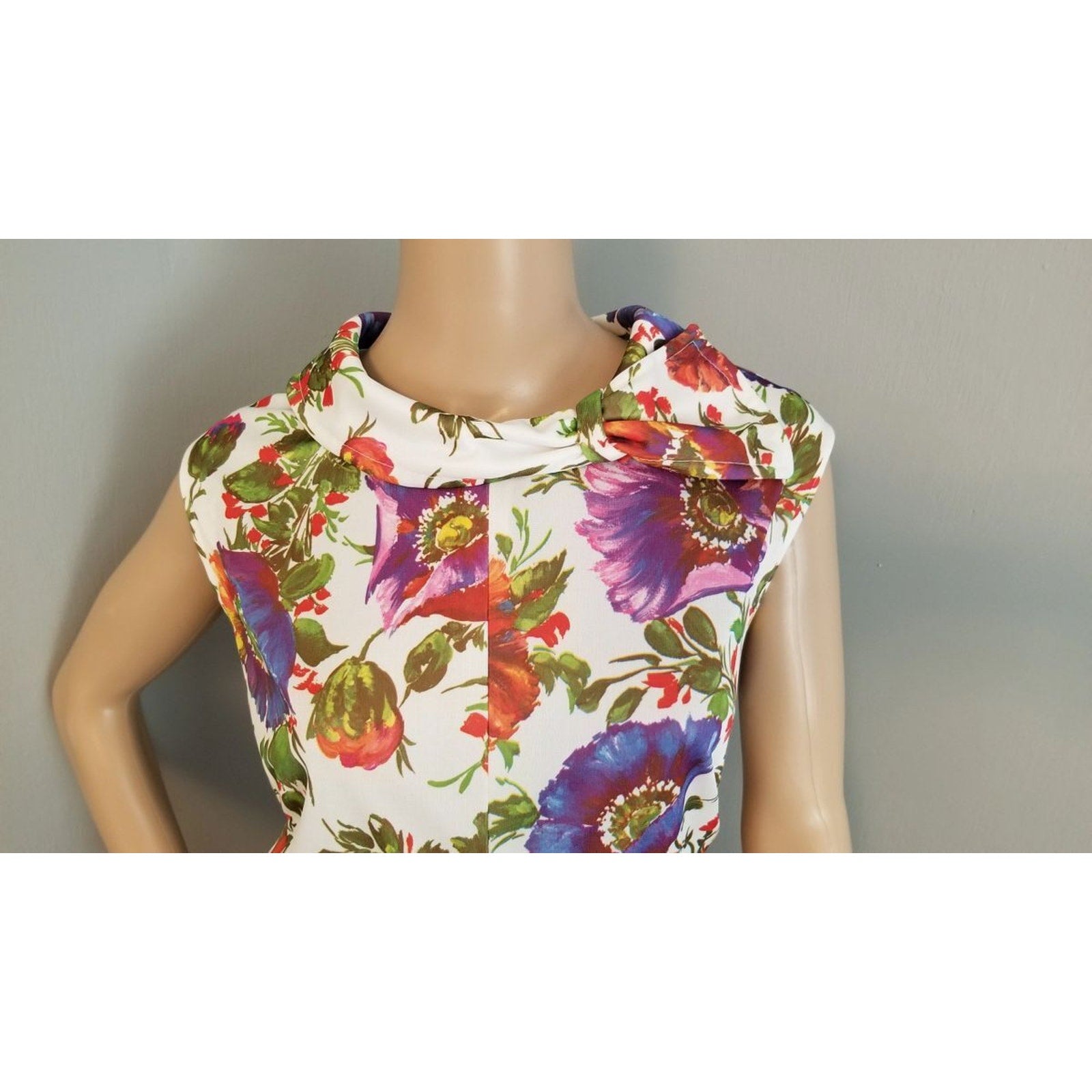 Features a darted bustline, back nylon zipper closure, multi-color huge poppy motif on polyester material. Ready to wear!