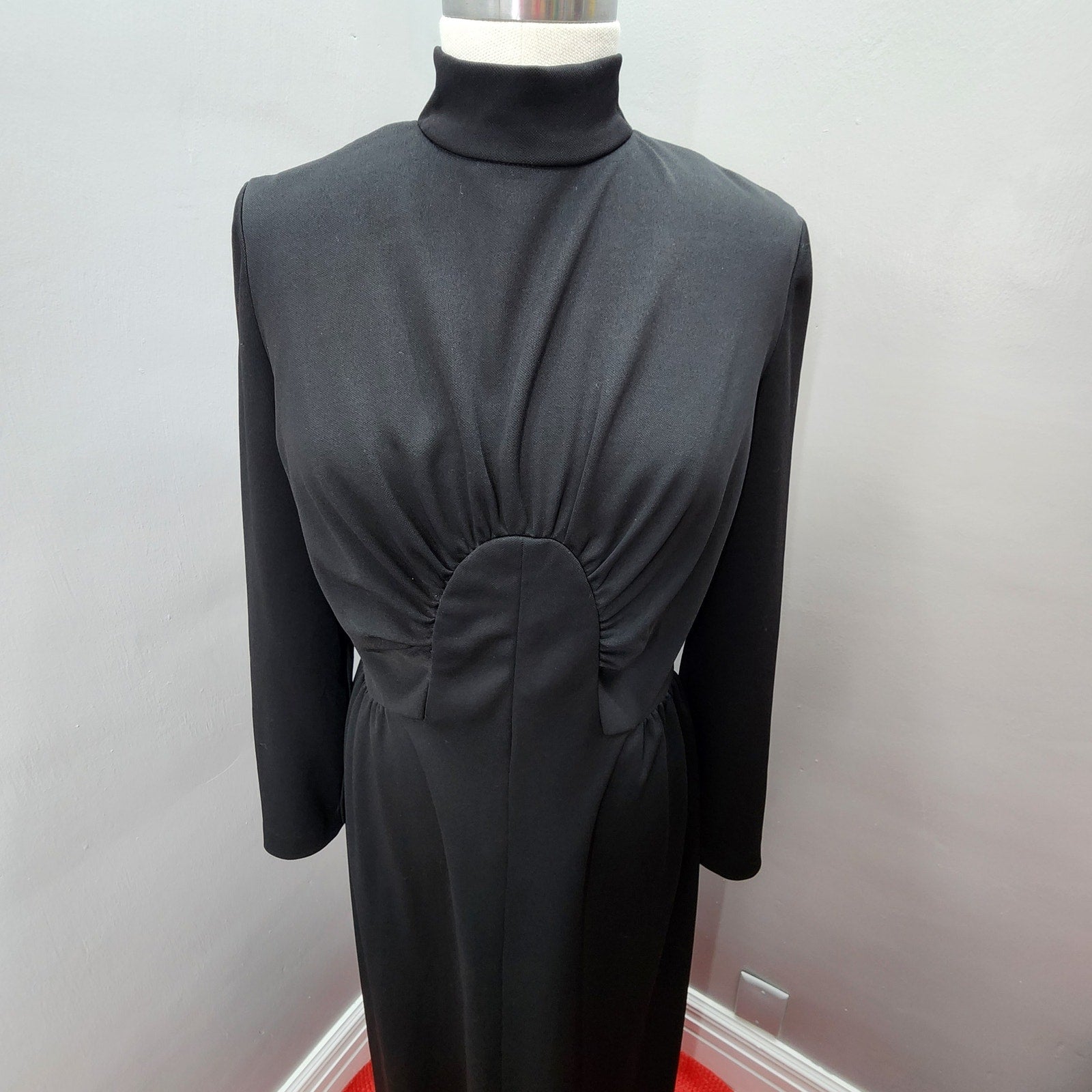 This long black column maxi dress features a high turtleneck collar and long sleeves, has a gathered, ruched, sunburst design at the bust, creating subtle detail and shaping at the waist.