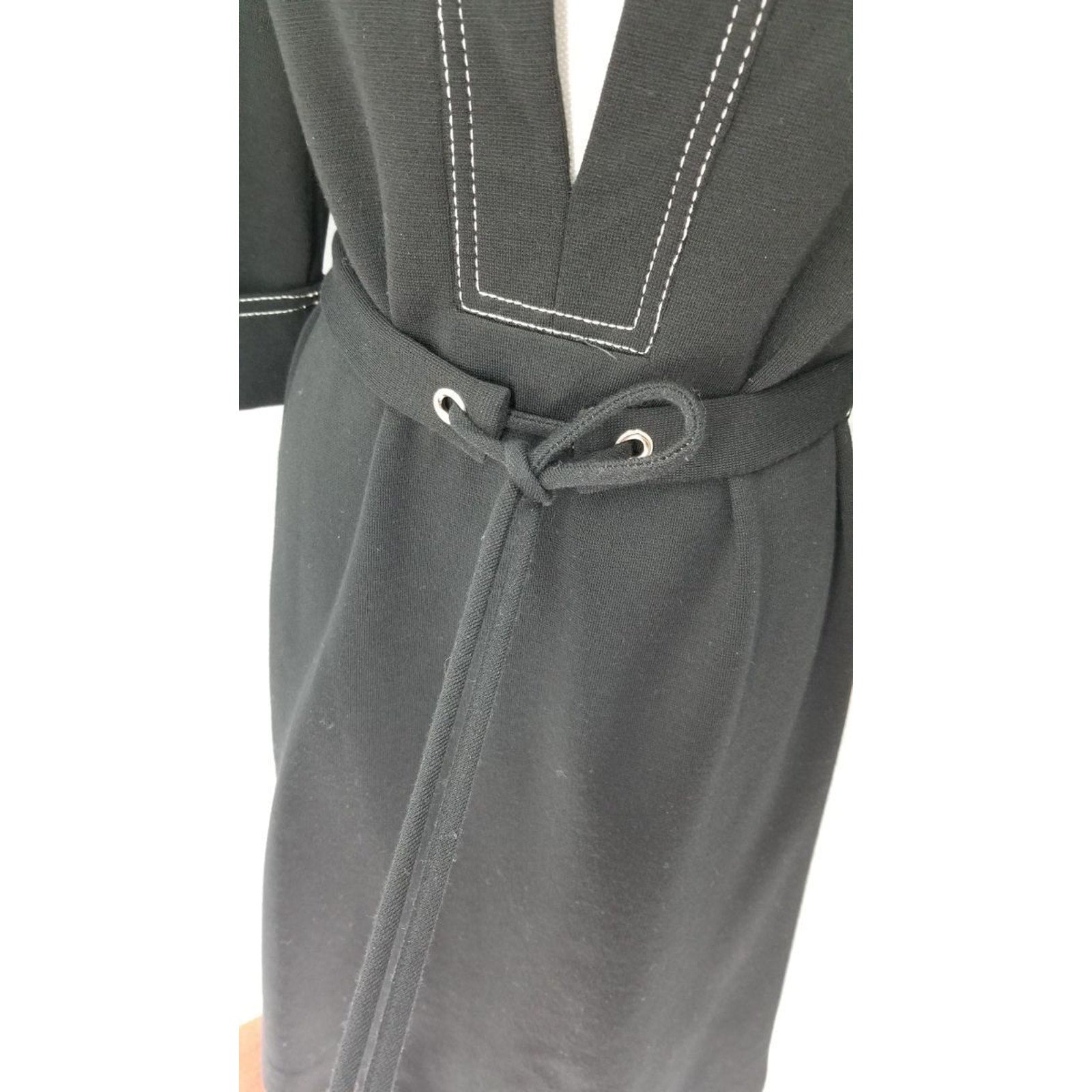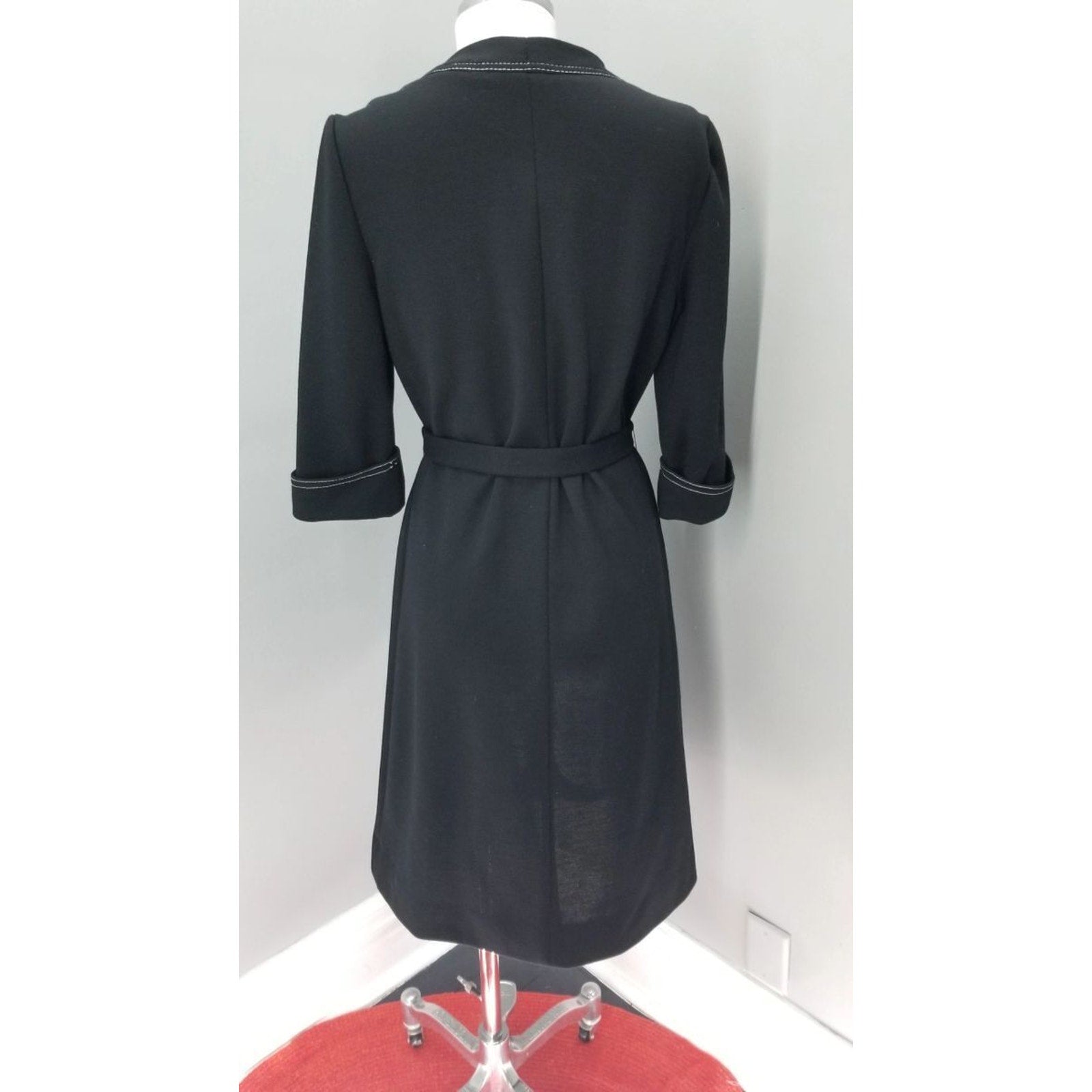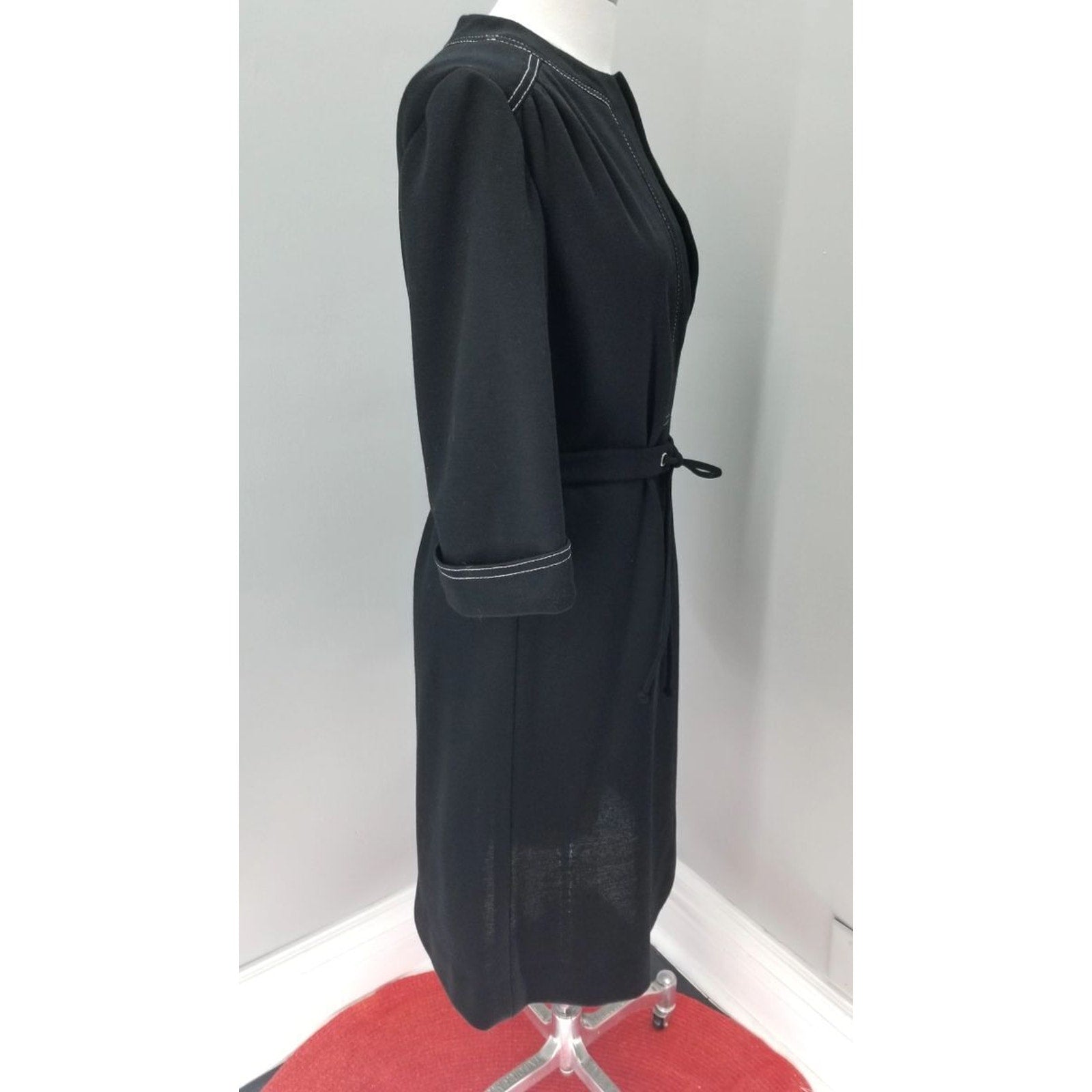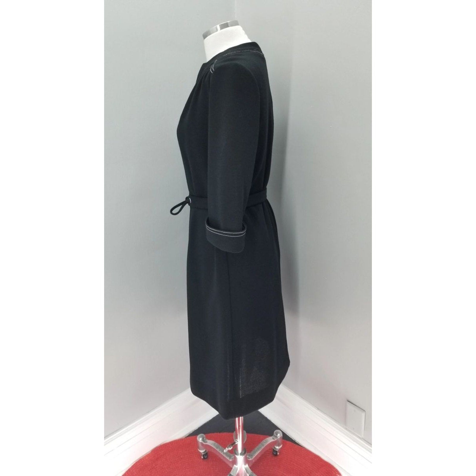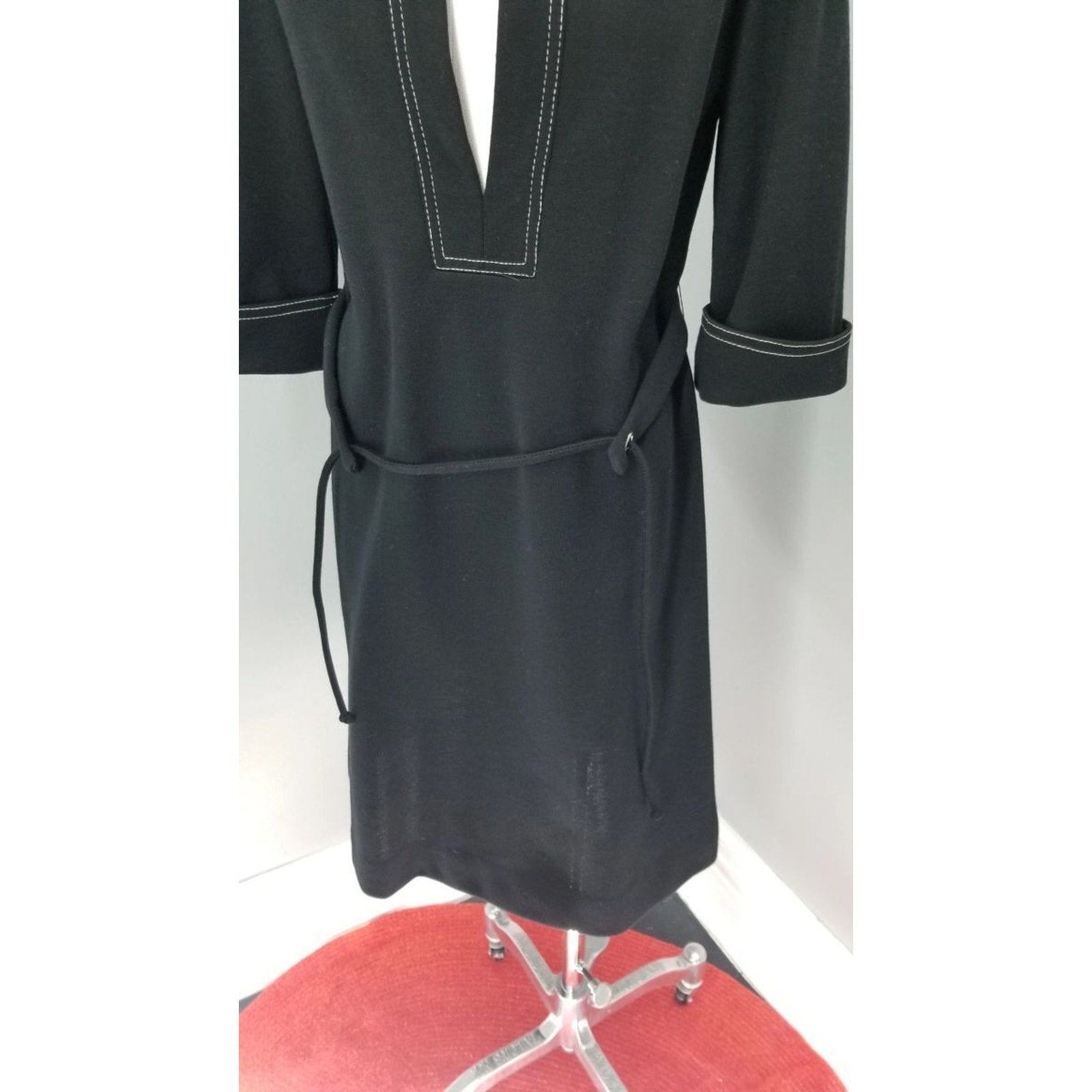Super cute belted shift dress. Black wool blend knit with contrast white stitching. Deep V cut neckline, 3/4 sleeves a unique belt.