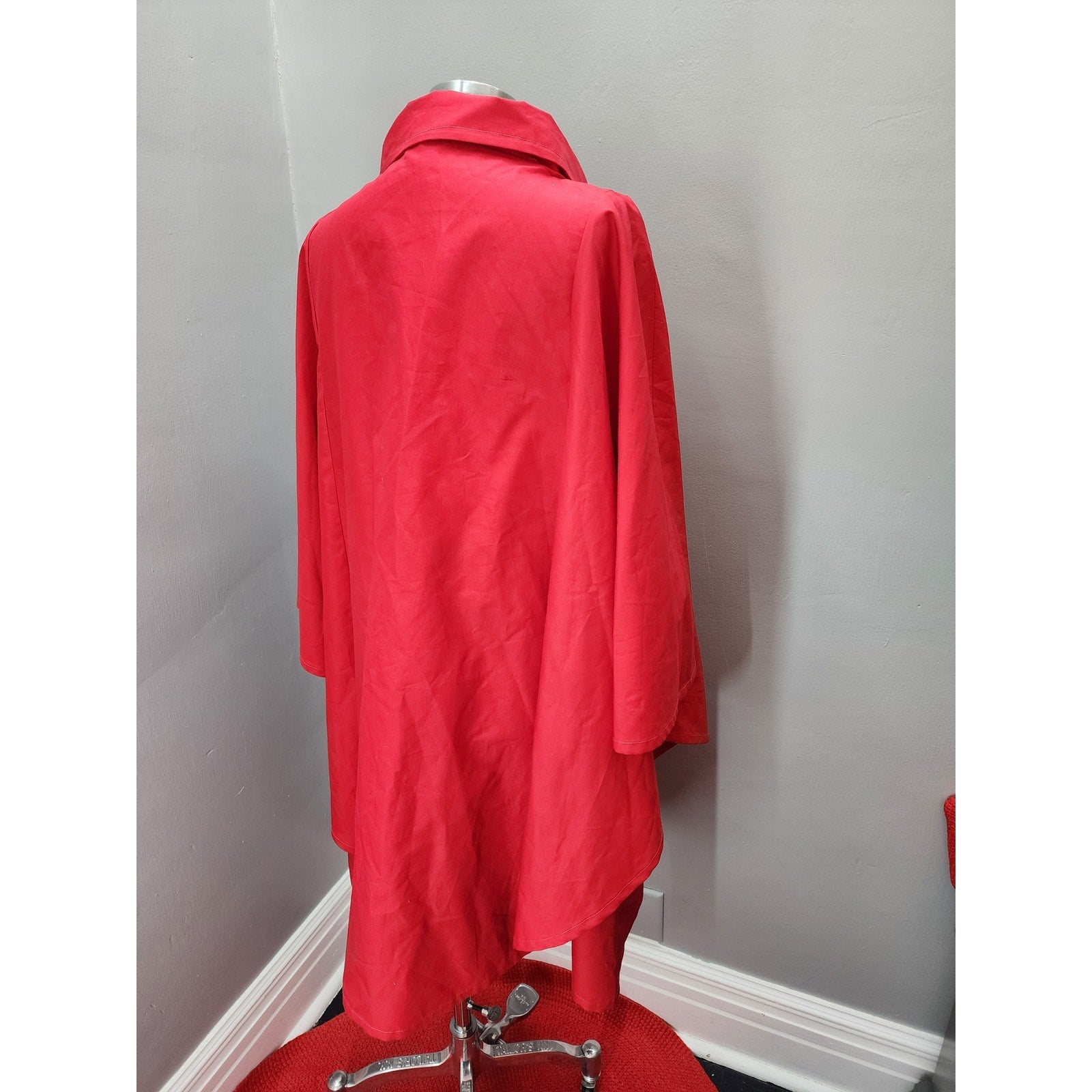 Super cute "cape" coat in a bright red. Two button closure at the neck, crossover button collar with huge full angel sleeves. Great little throw-over for a windy or rainy day!
