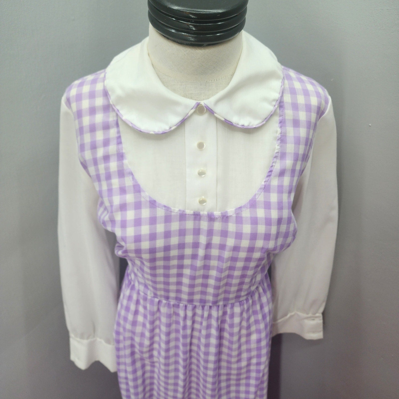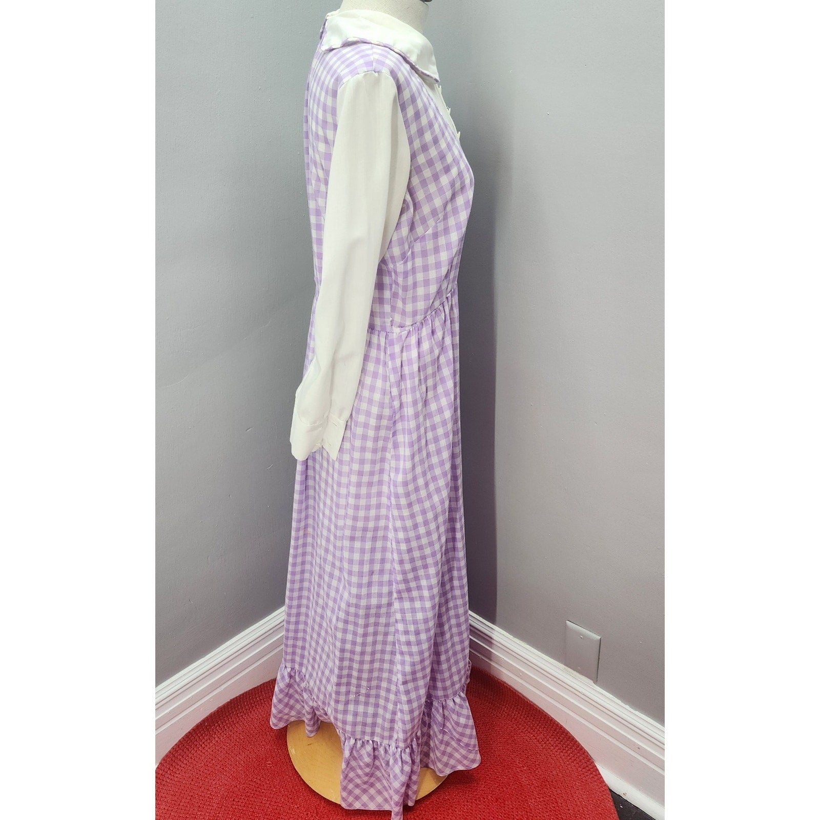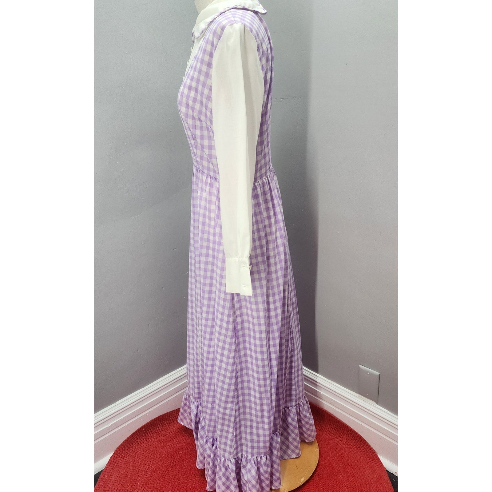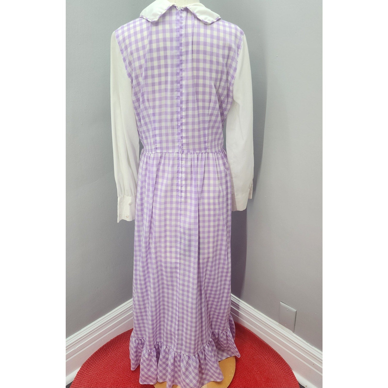 Fantastic classic 70s maxi. Purple and white gingham, with white bib, Peter Pan Collar, long cuffed sleeves, zipper back closure, darted bust and fitted waist.