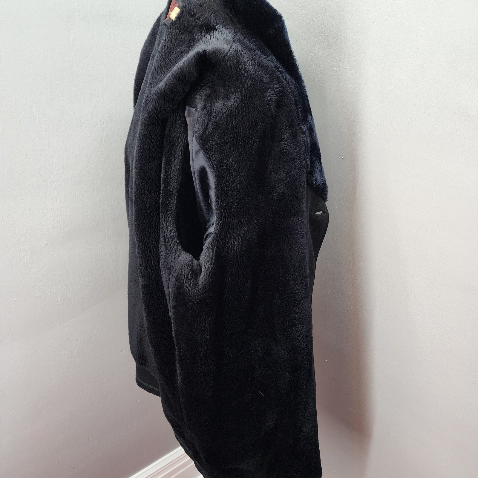 80s Men's Dan Jac Black Wool Winter Coat, Faux Fur - 46R