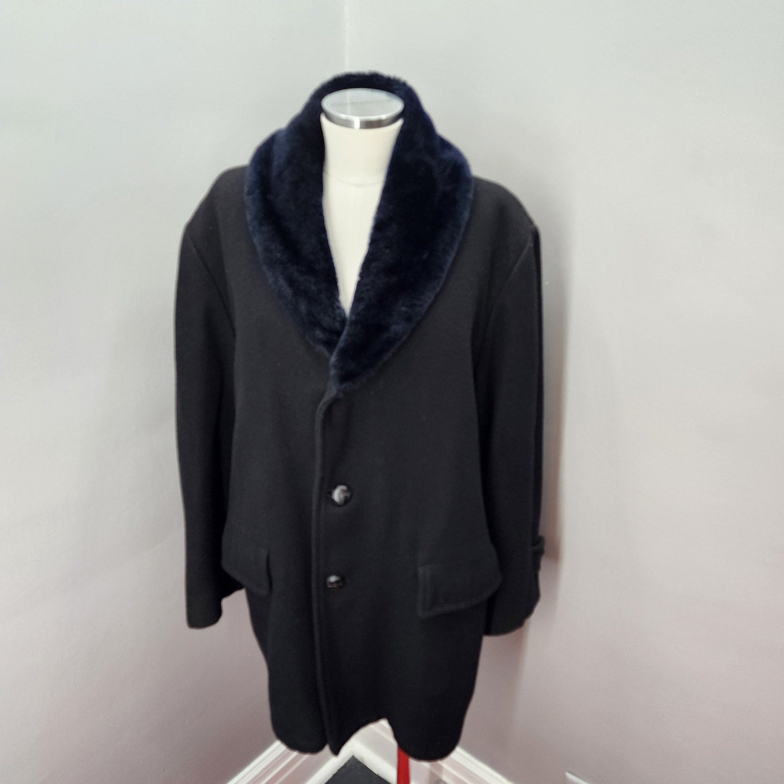 Classic 80s Dan Jac men's black wool winter coat. Faux fur lined bodice and shawl collar for extra warmth. Front flap pockets.