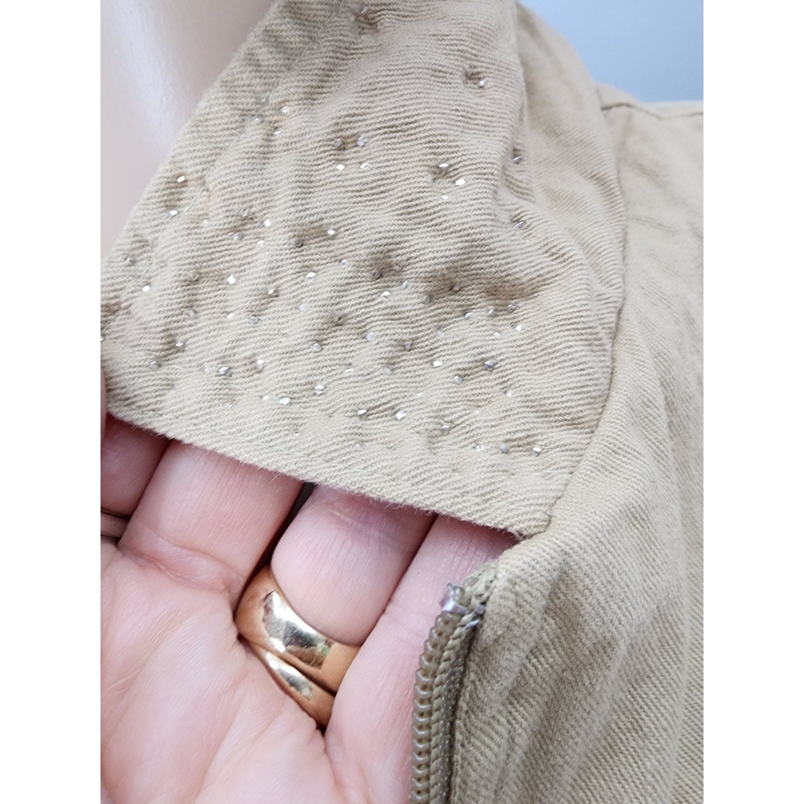 Jacket sports metal studs on collar, cuffs and pockets, waist cinching attached belt, zipper closure.
