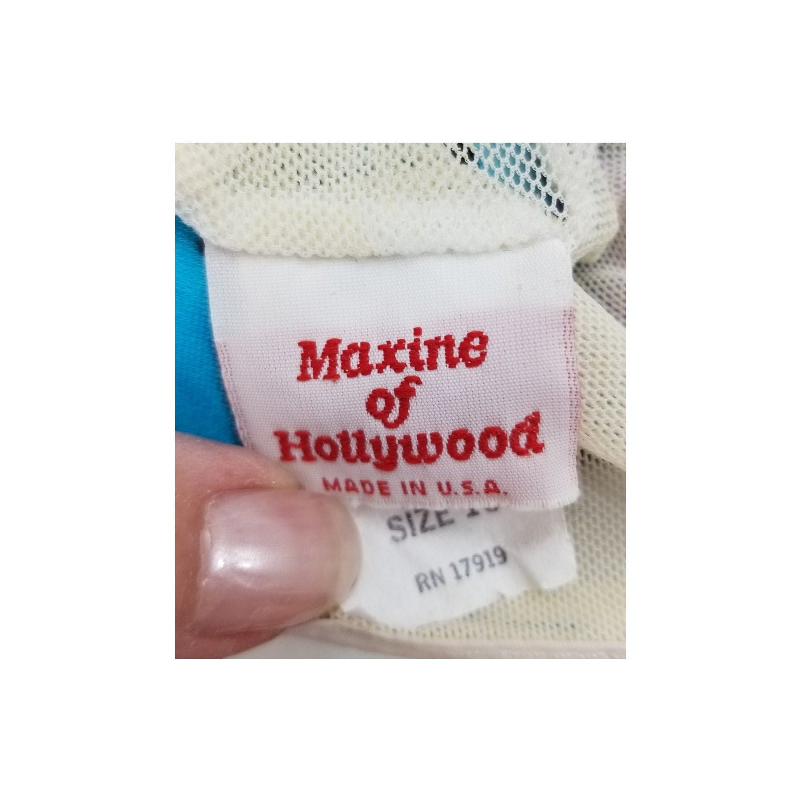 Classic 80s one piece swim dress by Maxine of Hollywood. This swim suit has molded cup bra with full body lining, attached swim pants with full skirt. Button adjustment at straps, scoop back. Elastic is good.