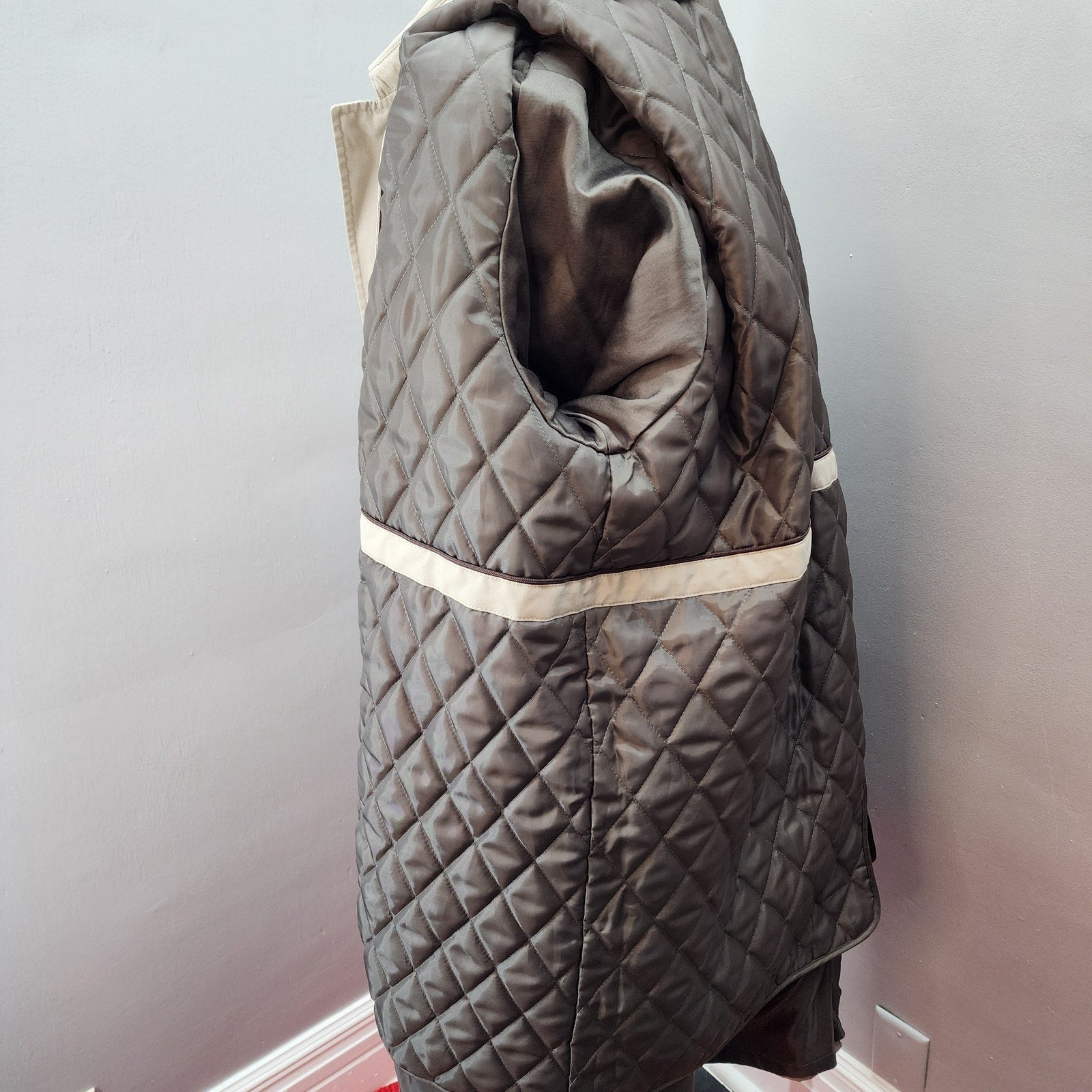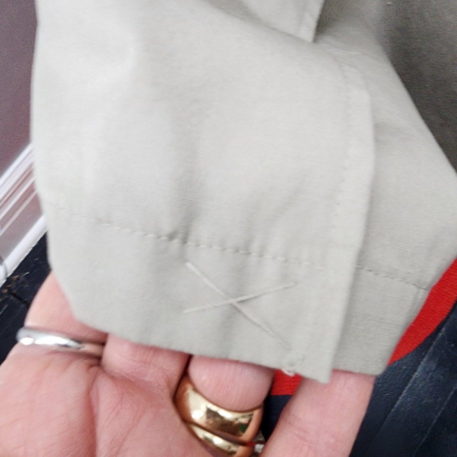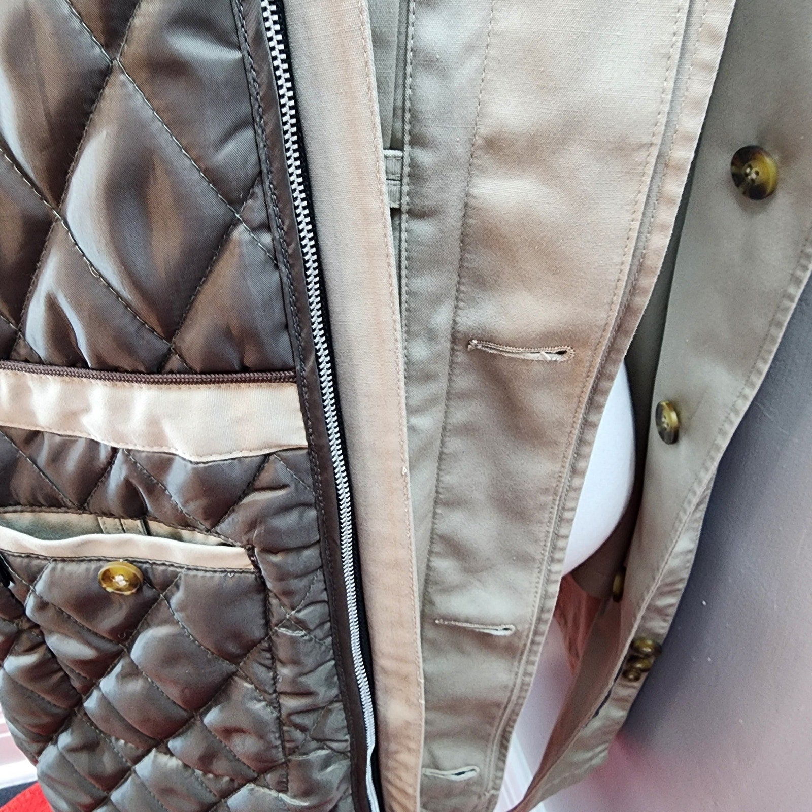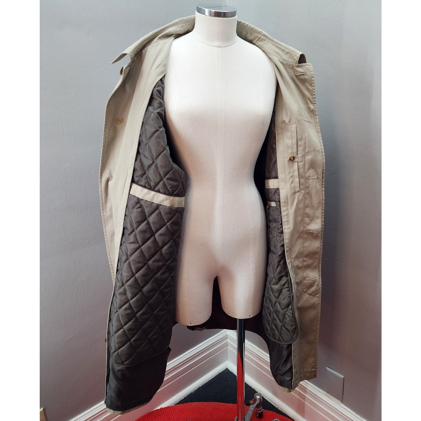 Classic 80s Stafford men's khaki colored all weather trench coat. Smart collar, hidden front button closure, zip out quilted lining. Little to no wear. Kick vent still stitched shut.