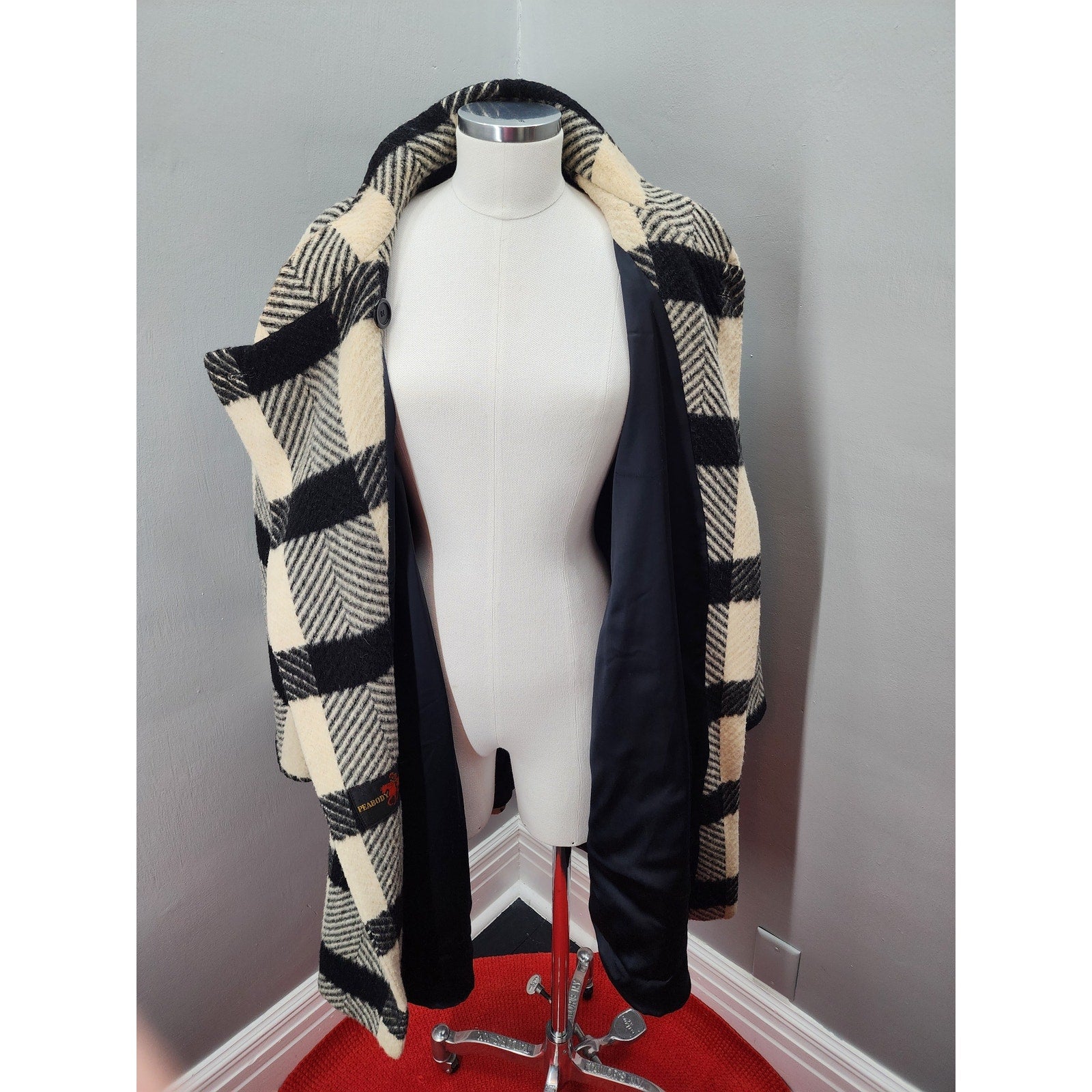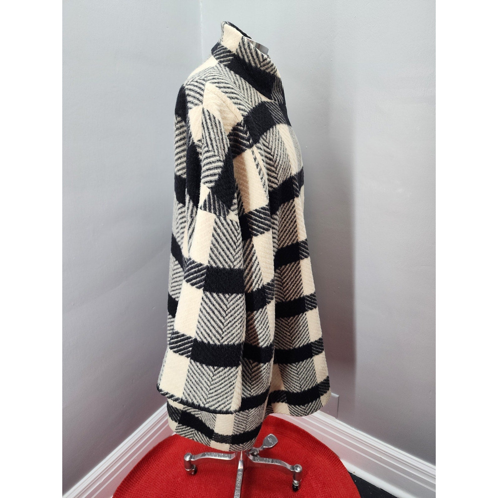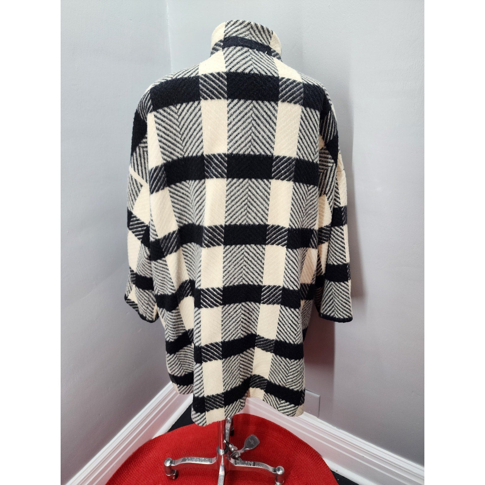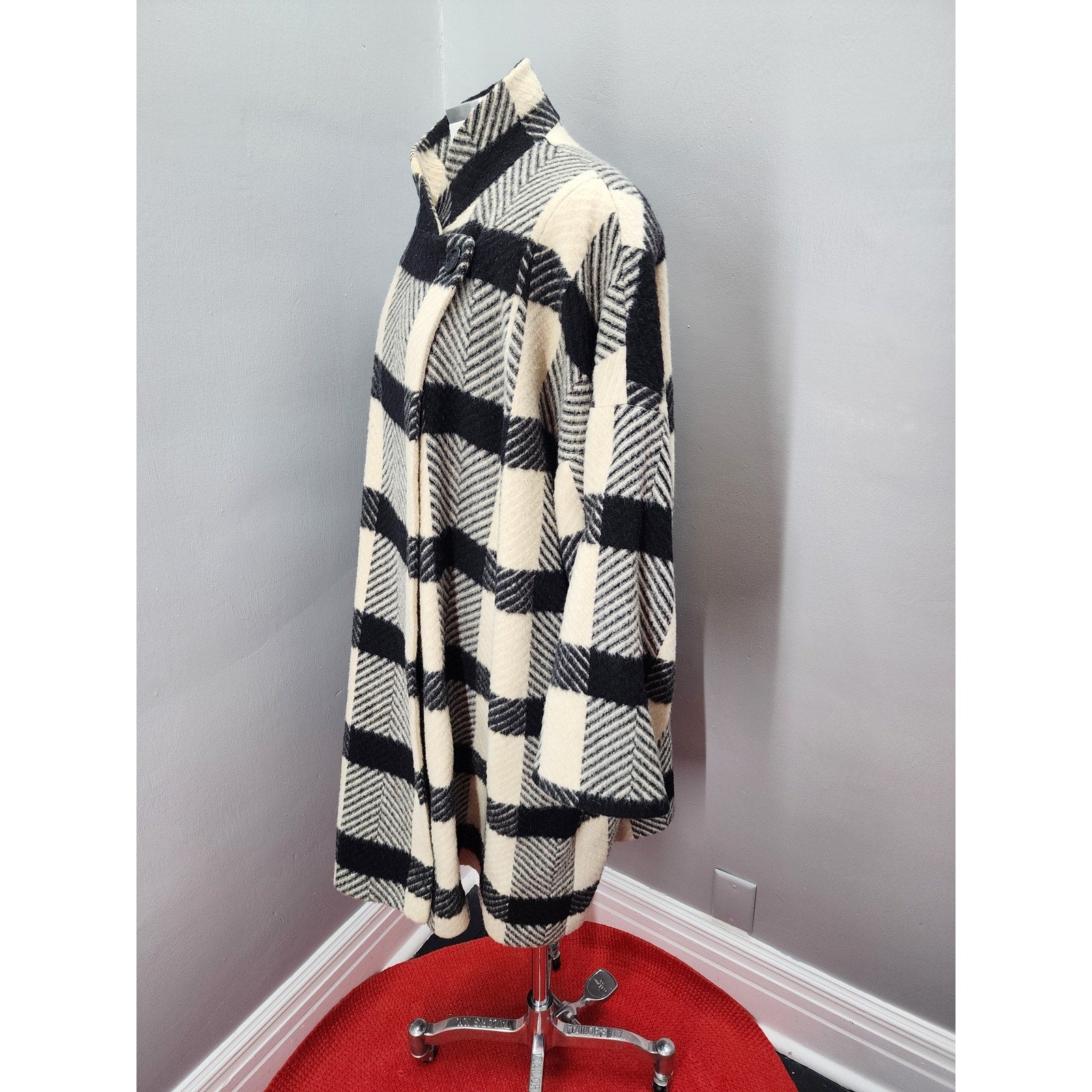 Fun 1980s oversized swing coat / cape in a classic black and cream plaid. Two button closure at the neck, two side pockets, wider bell sleeves, and large shoulder pads. Exterior is wool, mohair, alpaca and poliammidica with nice rayon lining.