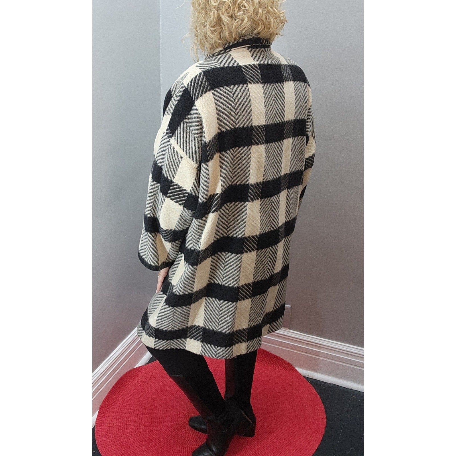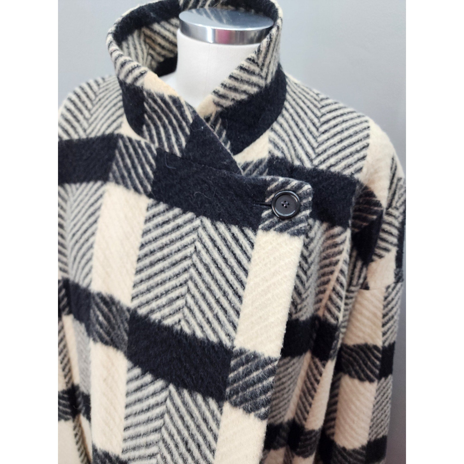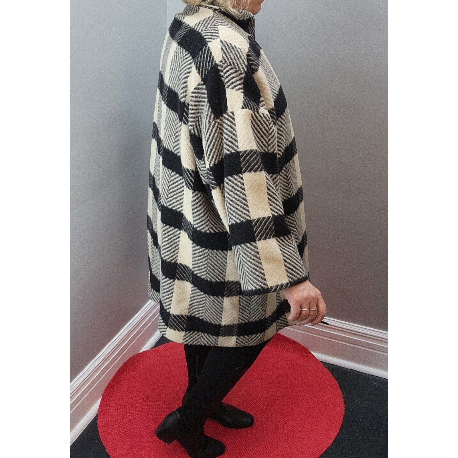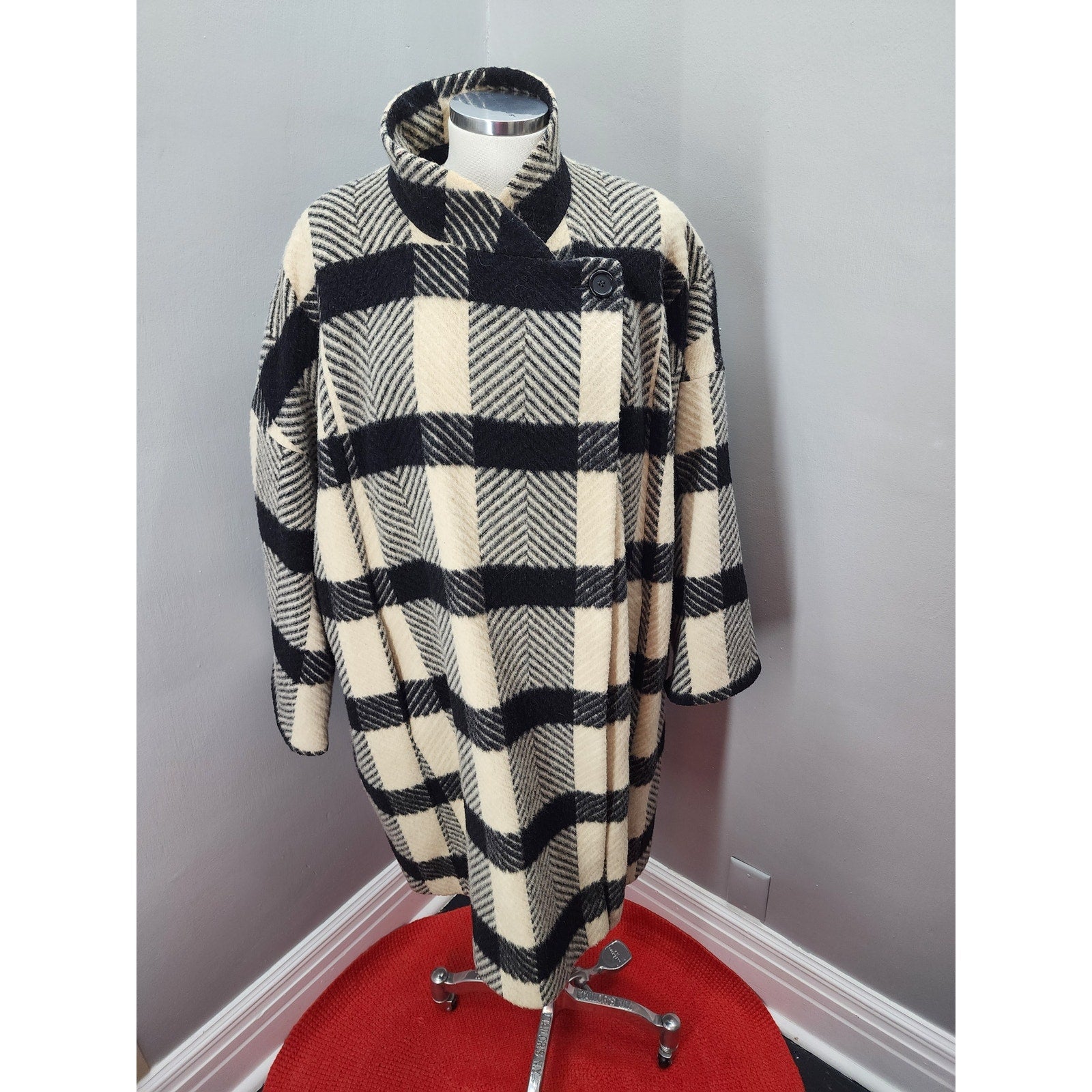 Fun 1980s oversized swing coat / cape in a classic black and cream plaid. Two button closure at the neck, two side pockets, wider bell sleeves, and large shoulder pads. Exterior is wool, mohair, alpaca and poliammidica with nice rayon lining.