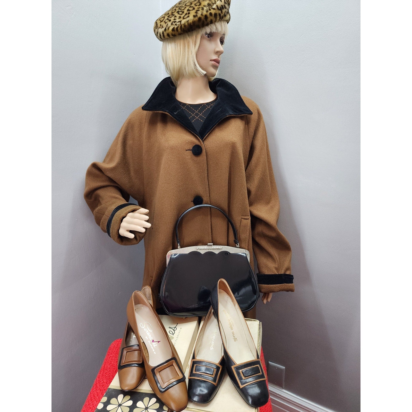Super sweet swing coat in a brown wool blend with velvet collar, covered buttons and trim detail. Fully lined with acetate lining.