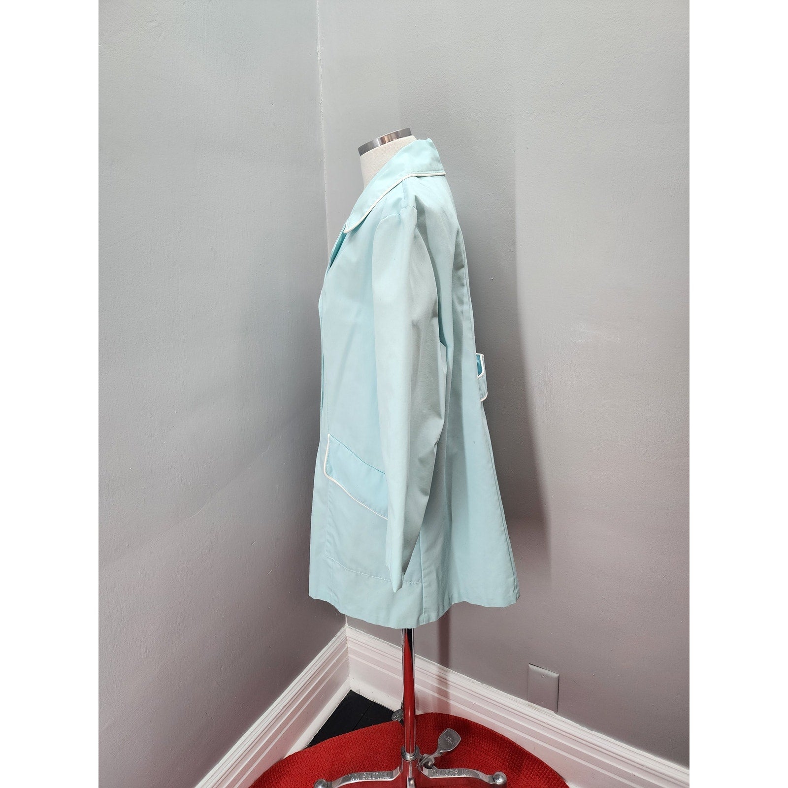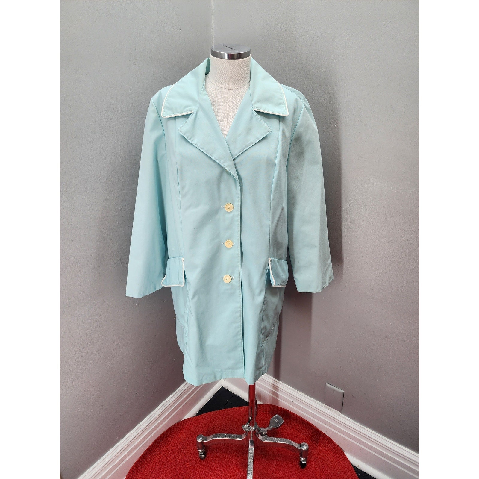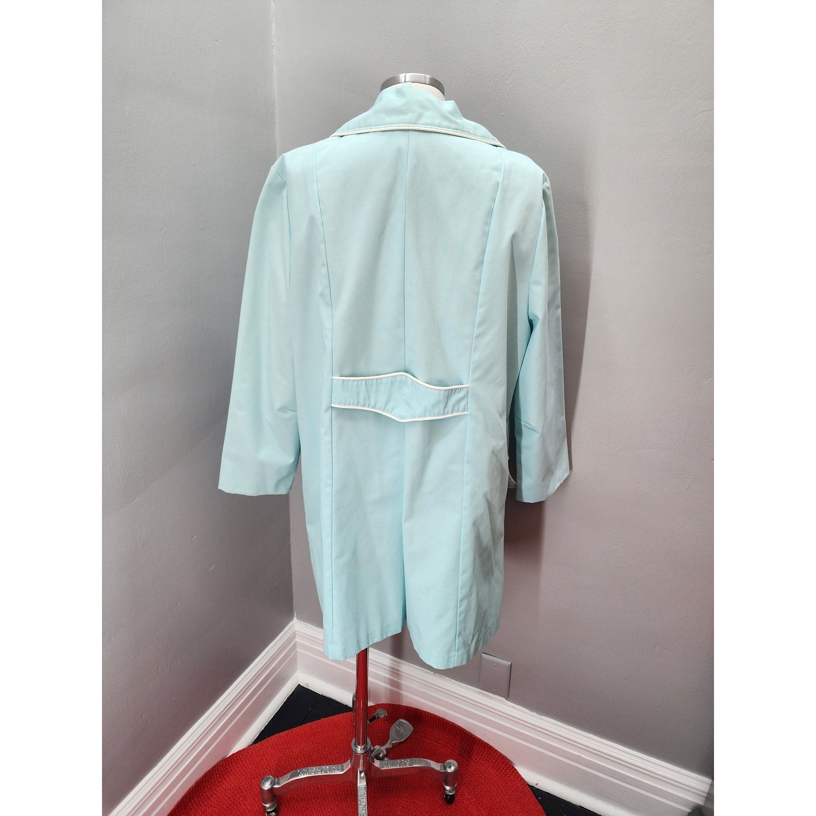 Cute spring overcoat in robbin egg blue with contrasting white trim. Material tags missing, but appears to be a heavy cotton blend with a nylon lining. Measurements indicate that this is an extra large petite (arm length).