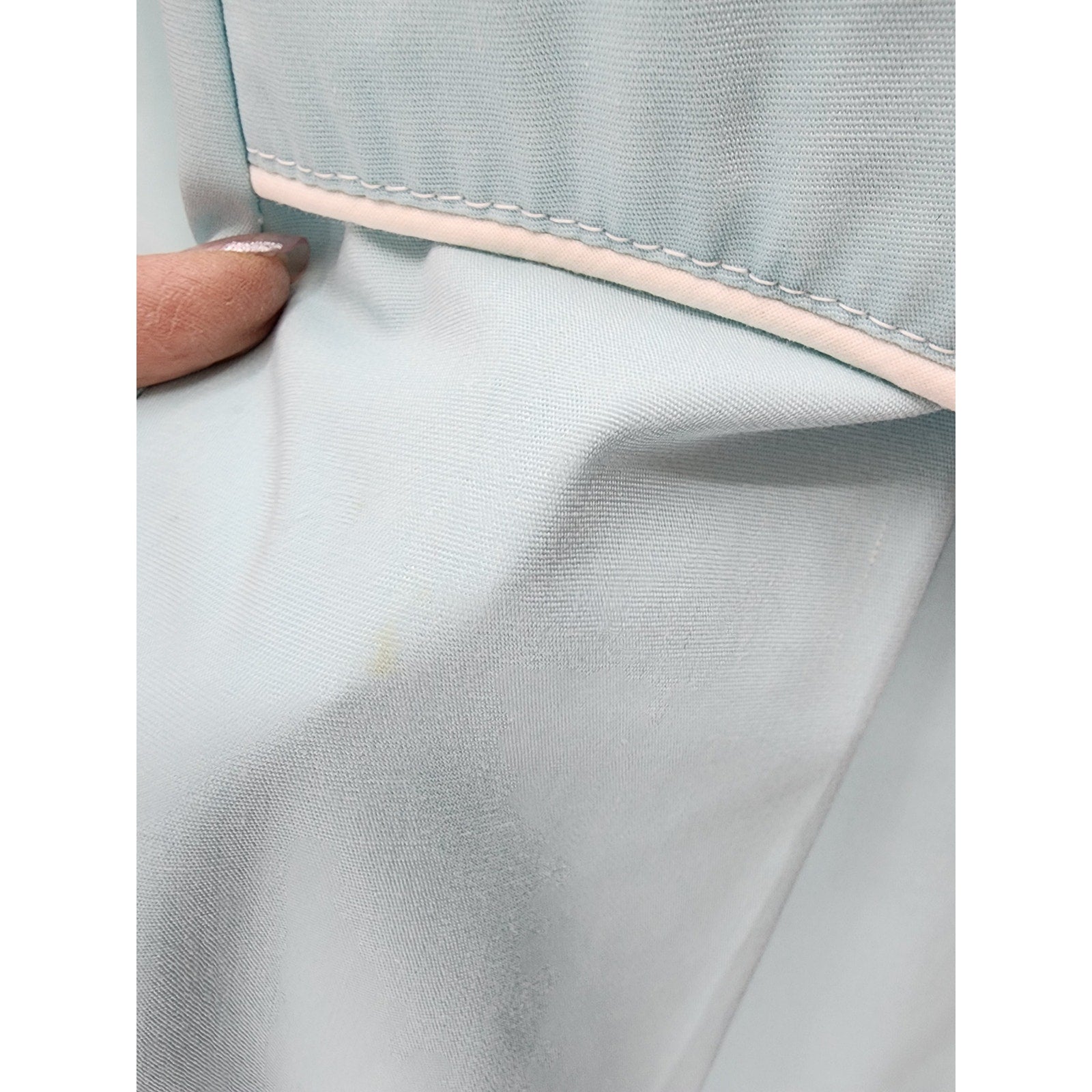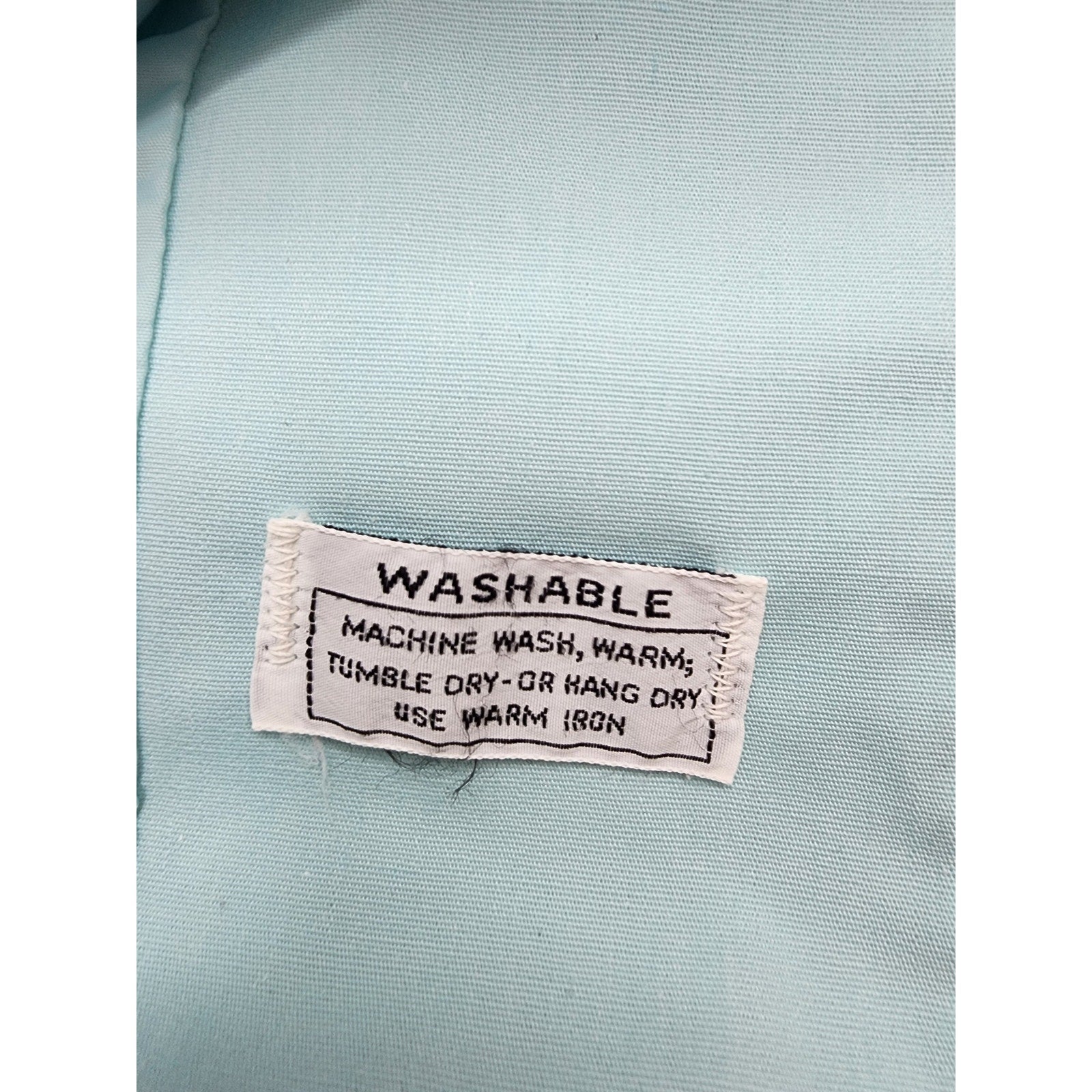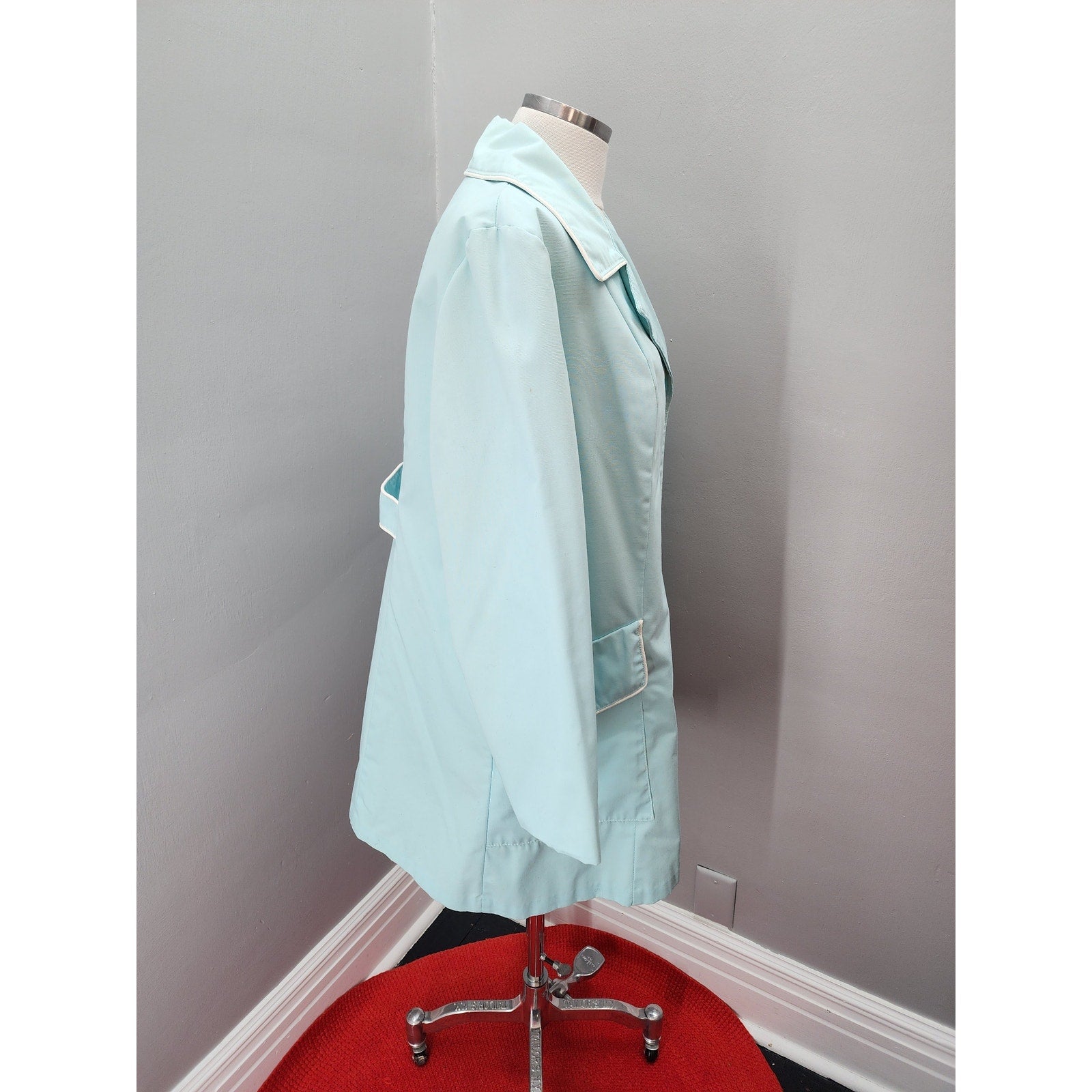 Cute spring overcoat in robbin egg blue with contrasting white trim. Material tags missing, but appears to be a heavy cotton blend with a nylon lining. Measurements indicate that this is an extra large petite (arm length).