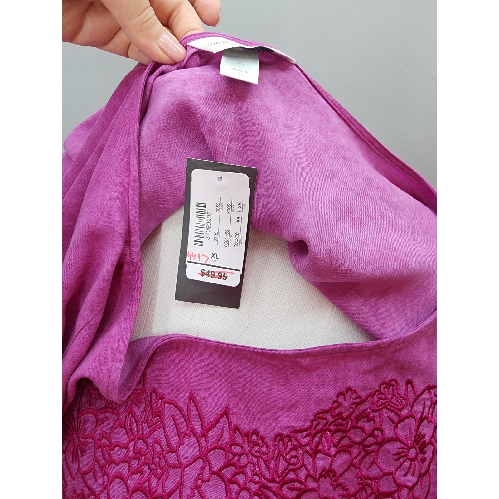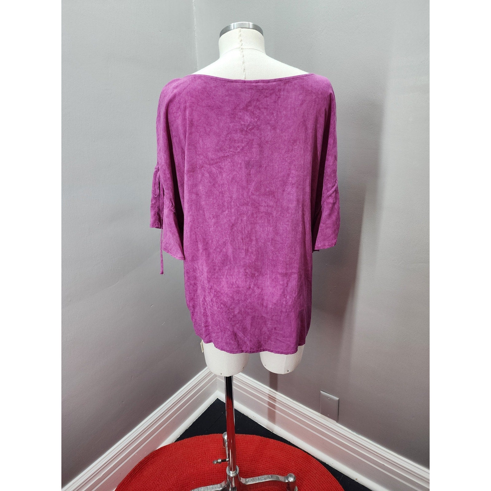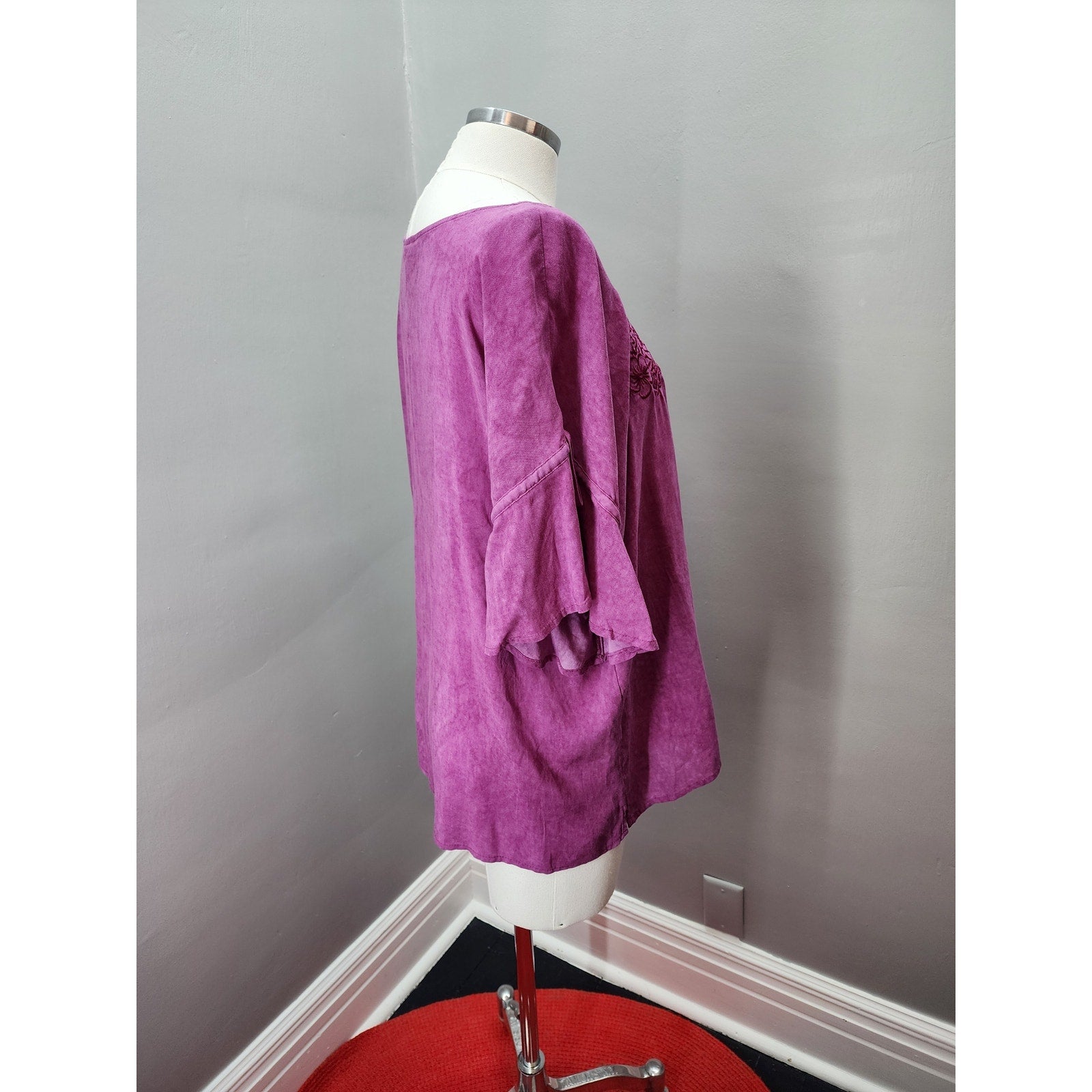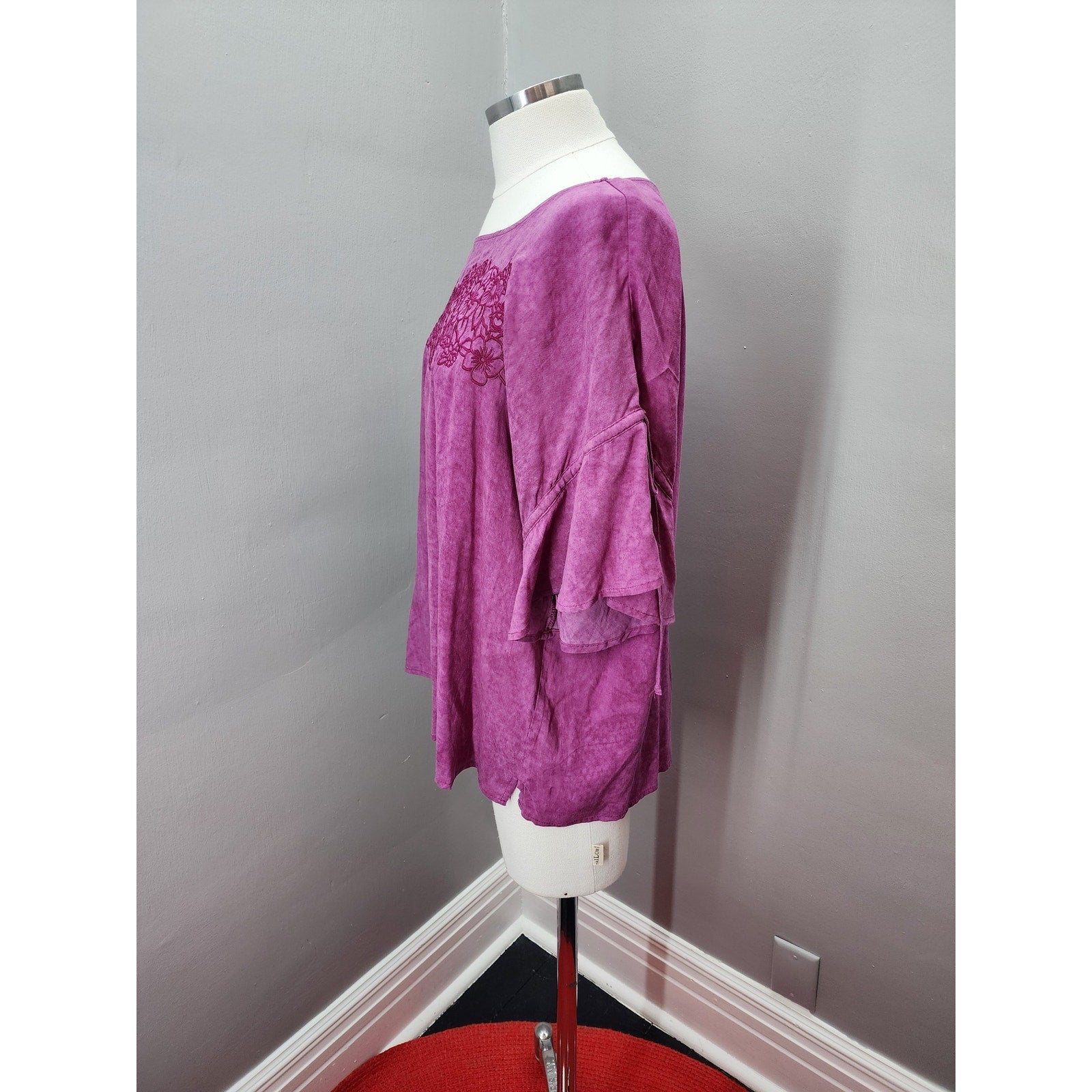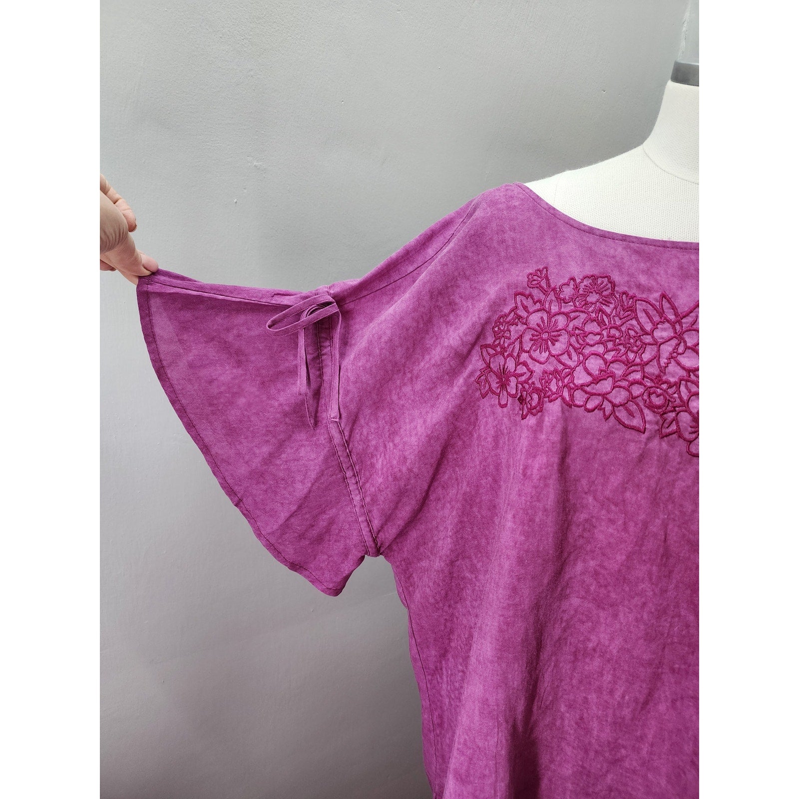 Cute fuchsia colored top with wide scoop neck neckline, drop shoulders and flutter angel sleeves. Has an embroidered chest and easy hang straight cut hem.