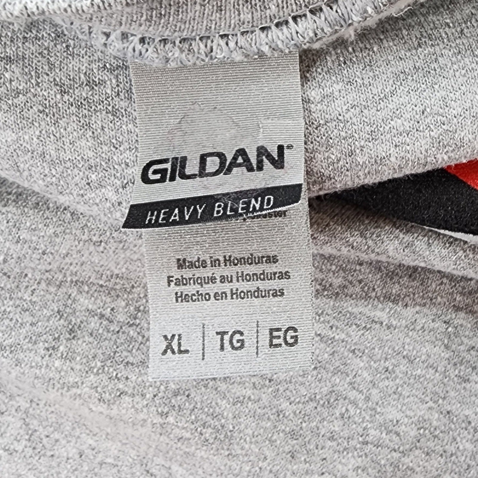 Heather gray Gildan sweatshirt with Swiss Heritage Village screen print.