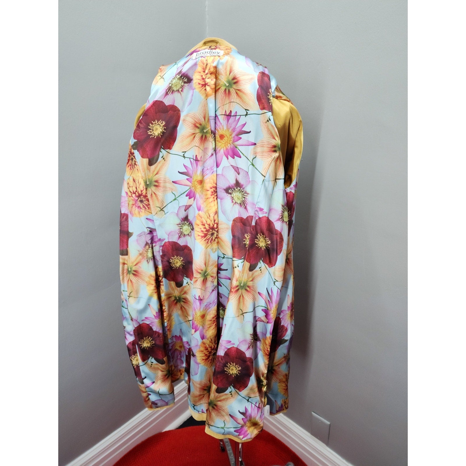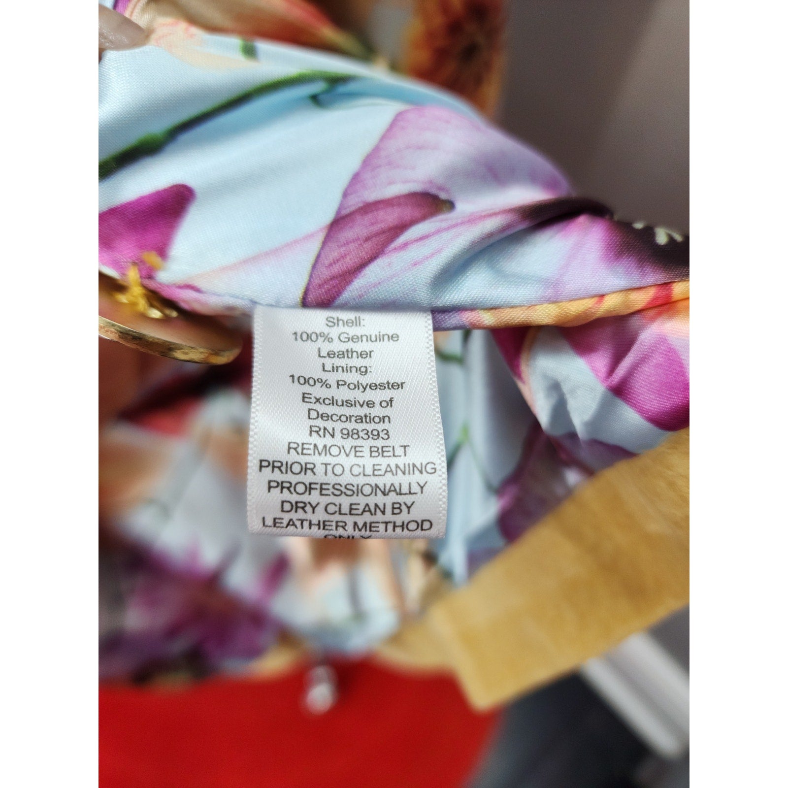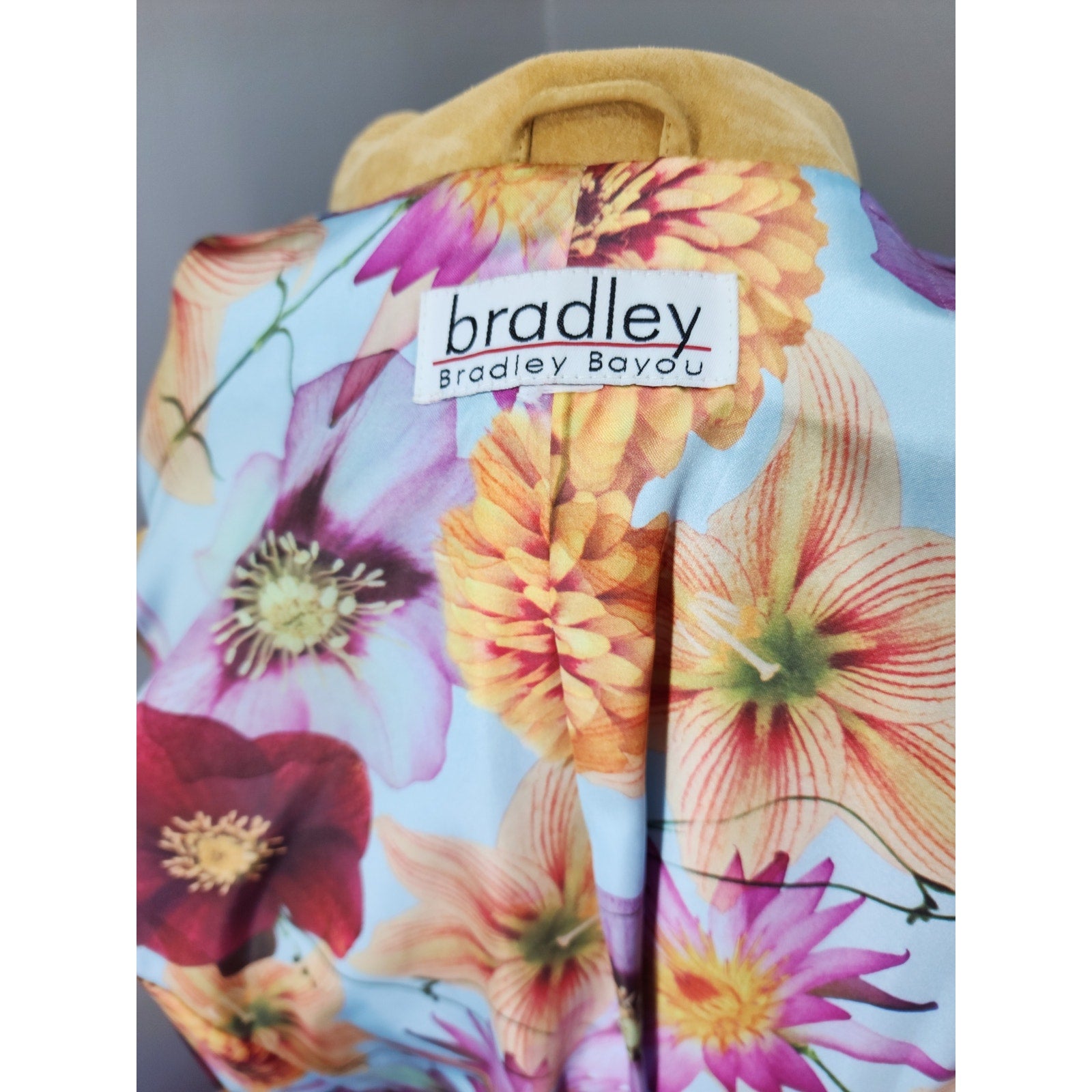 Soft and supple suede coat in a soft yellow with gold metal button, buckle and grommet detail. Awesome polyester floral lining of pansies, dahlias and lilies- SWOON!