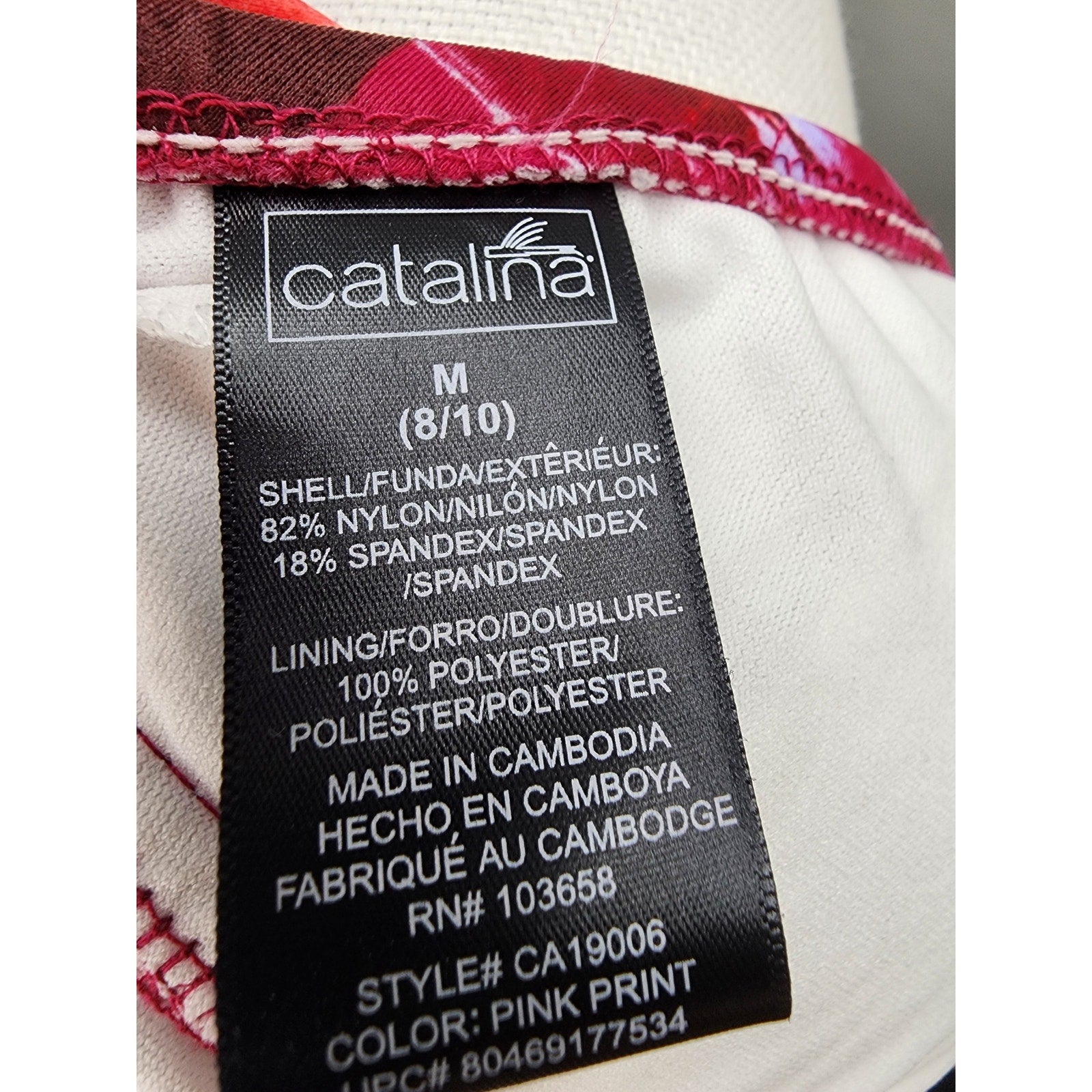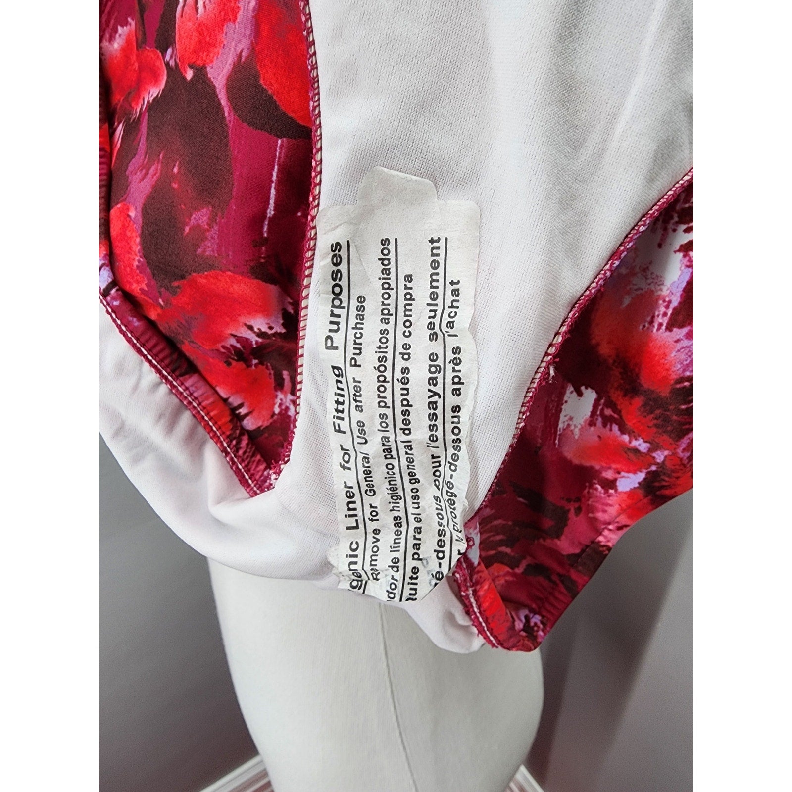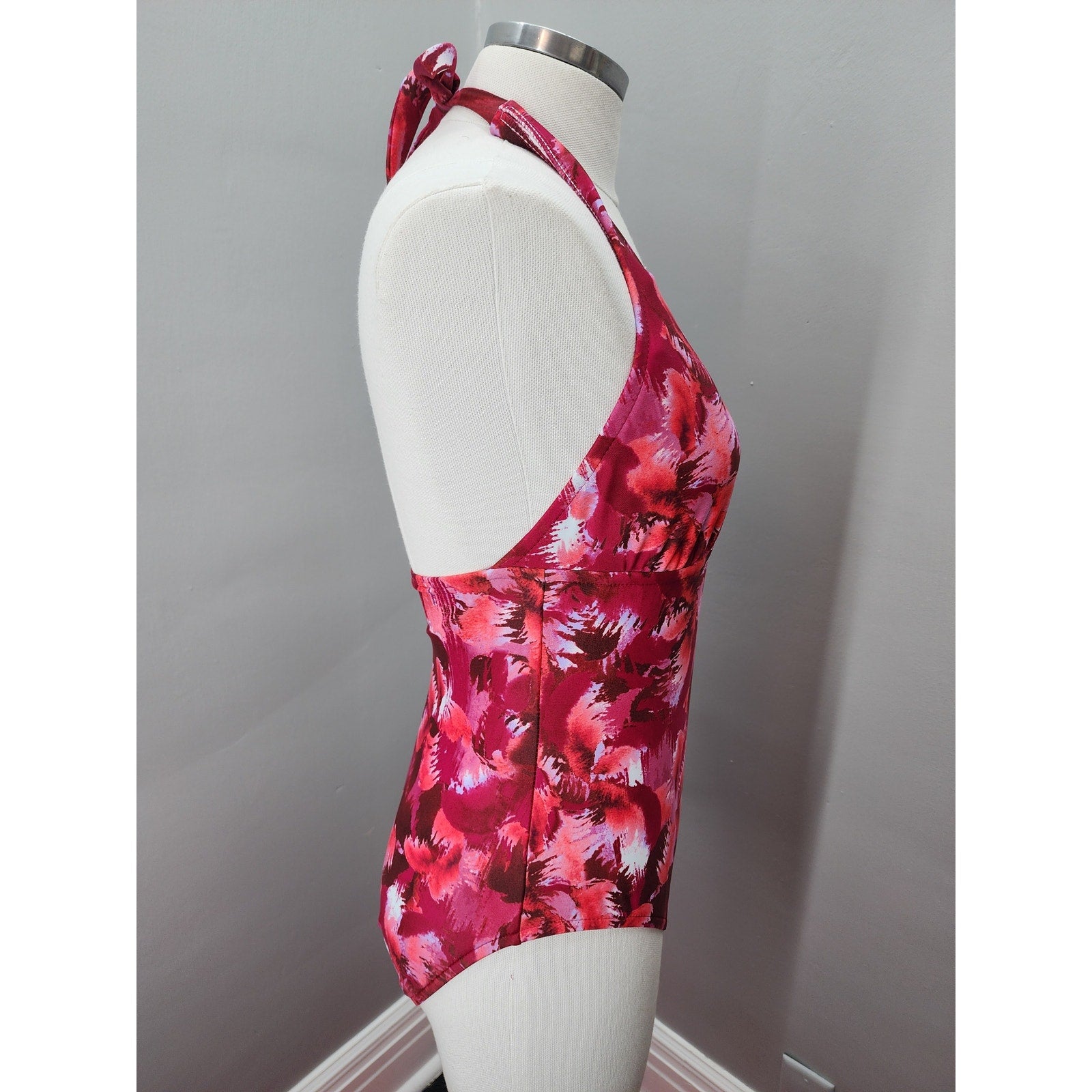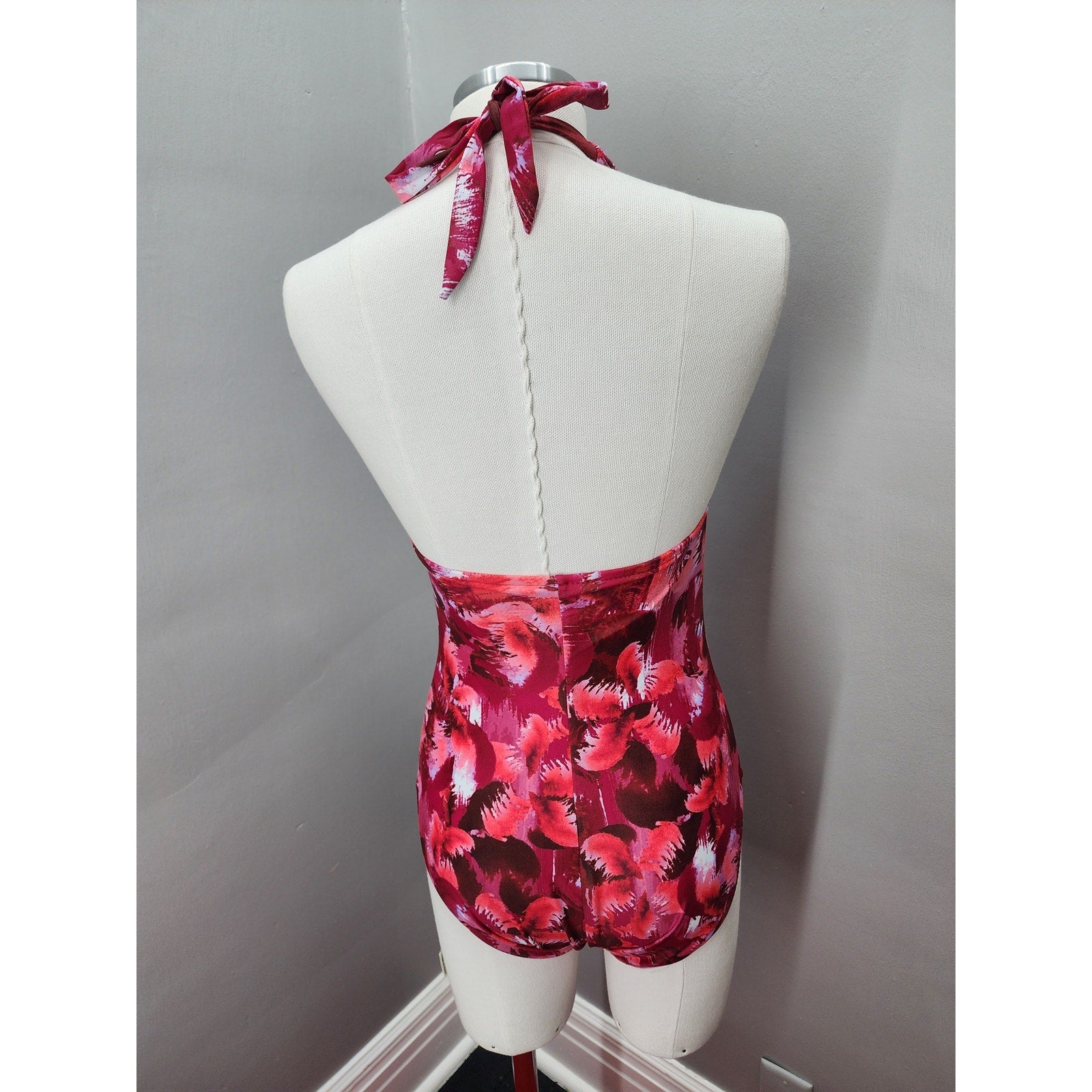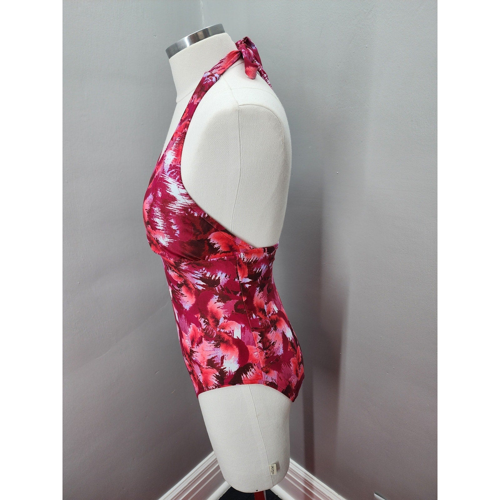 Cute abstract design in red, raspberry and white. New without tags, fully lined, halter top and 3/4 back, high cut thigh.